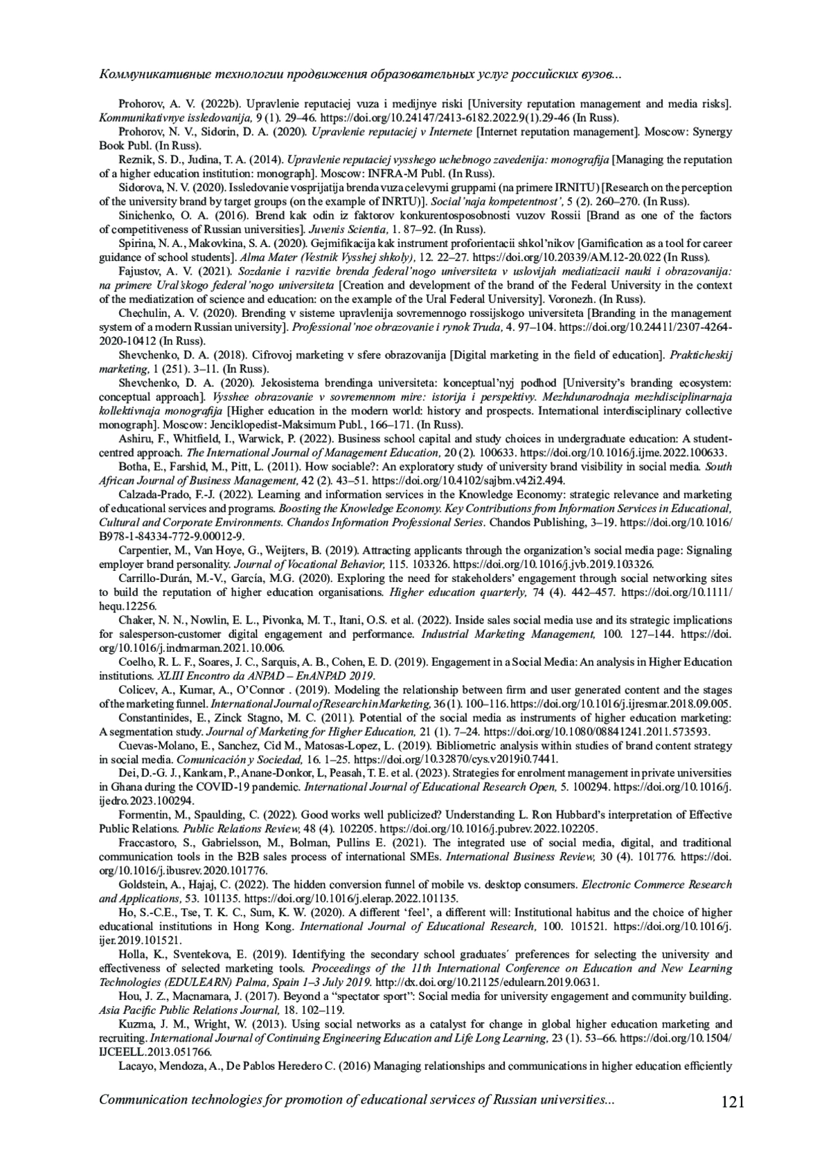 17. Прохоров А. В. Управление репутацией вуза и медийные риски // Коммуникативные исследования. 2022б. Т. 9, № 1. С. 29-46. DOI: 10.24147/2413-6182.2022.9(1).29-46 EDN: MMRGDE