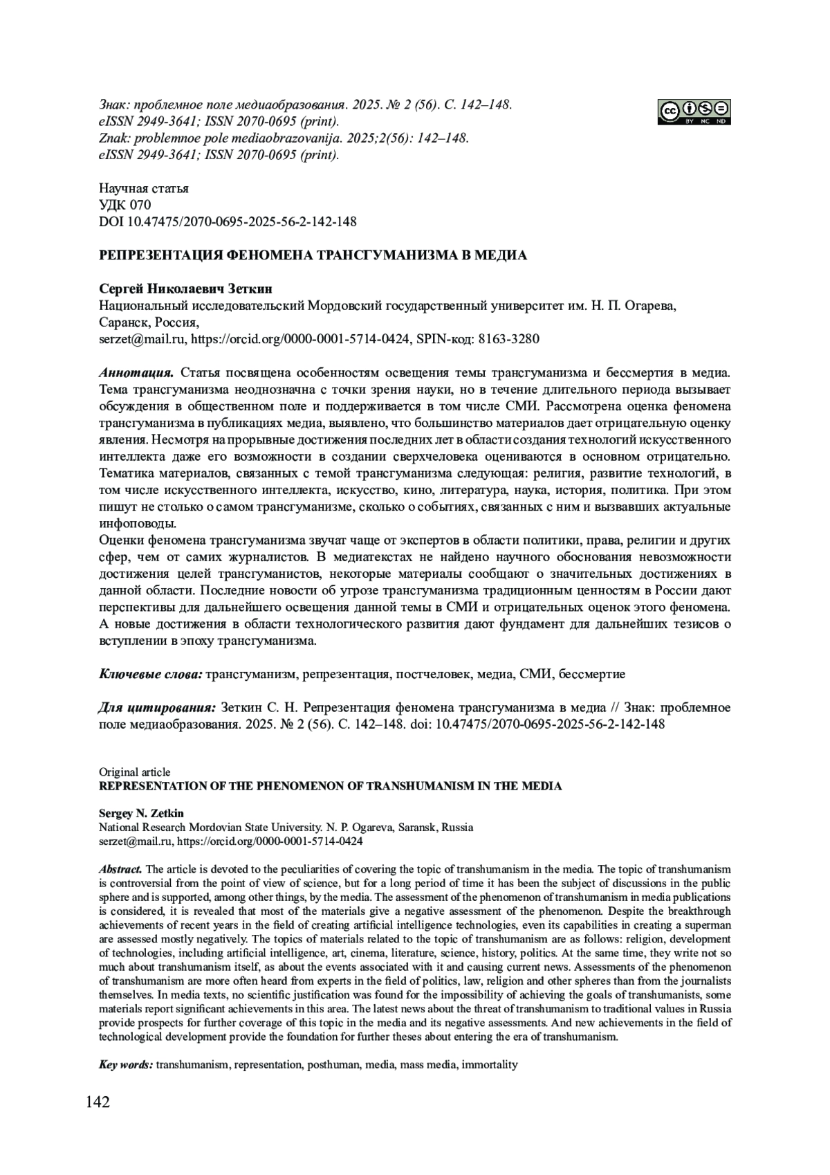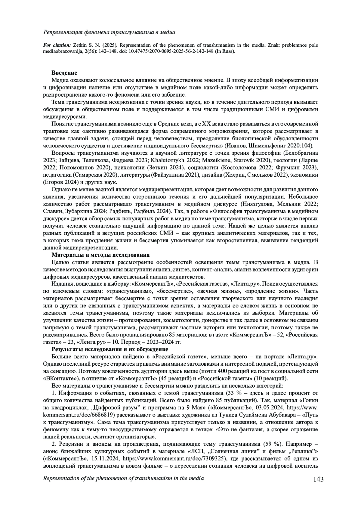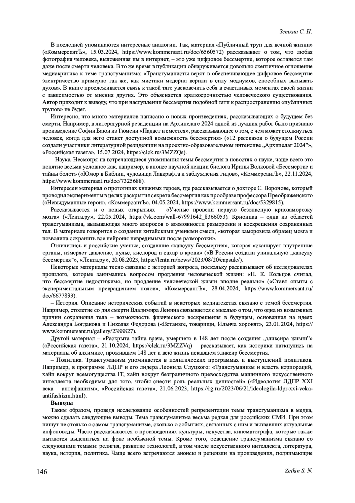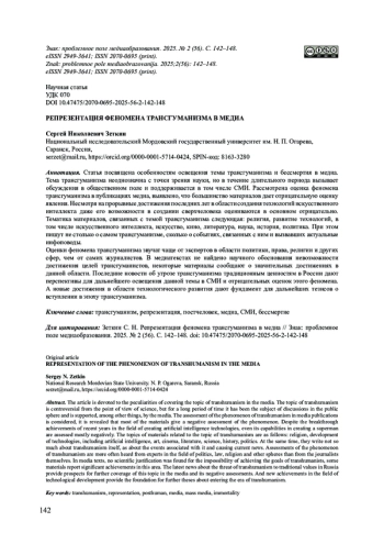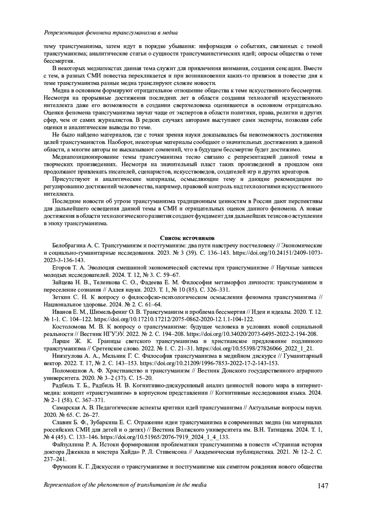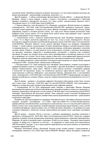 12. Славин Б. Ф., Зубаркина Е. С. Отражение идеи трансгуманизма в современных медиа (на материалах российских СМИ для детей и о детях) // Вестник Волжского университета им. В.Н. Татищева. 2024. Т. 1, № 4 (45). С. 133-146. DOI: 10.51965/2076-7919_2024_1_4_133 EDN: TBLVSQ