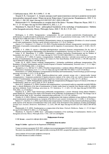 17. Mazeikiene N., Starovik P. Socio - philosophical foundations of the mythology of transhumanism // Bulletin of the Karaganda university. History. Philosophy Series. 2020. Т. 99, № 3. P. 225-232.