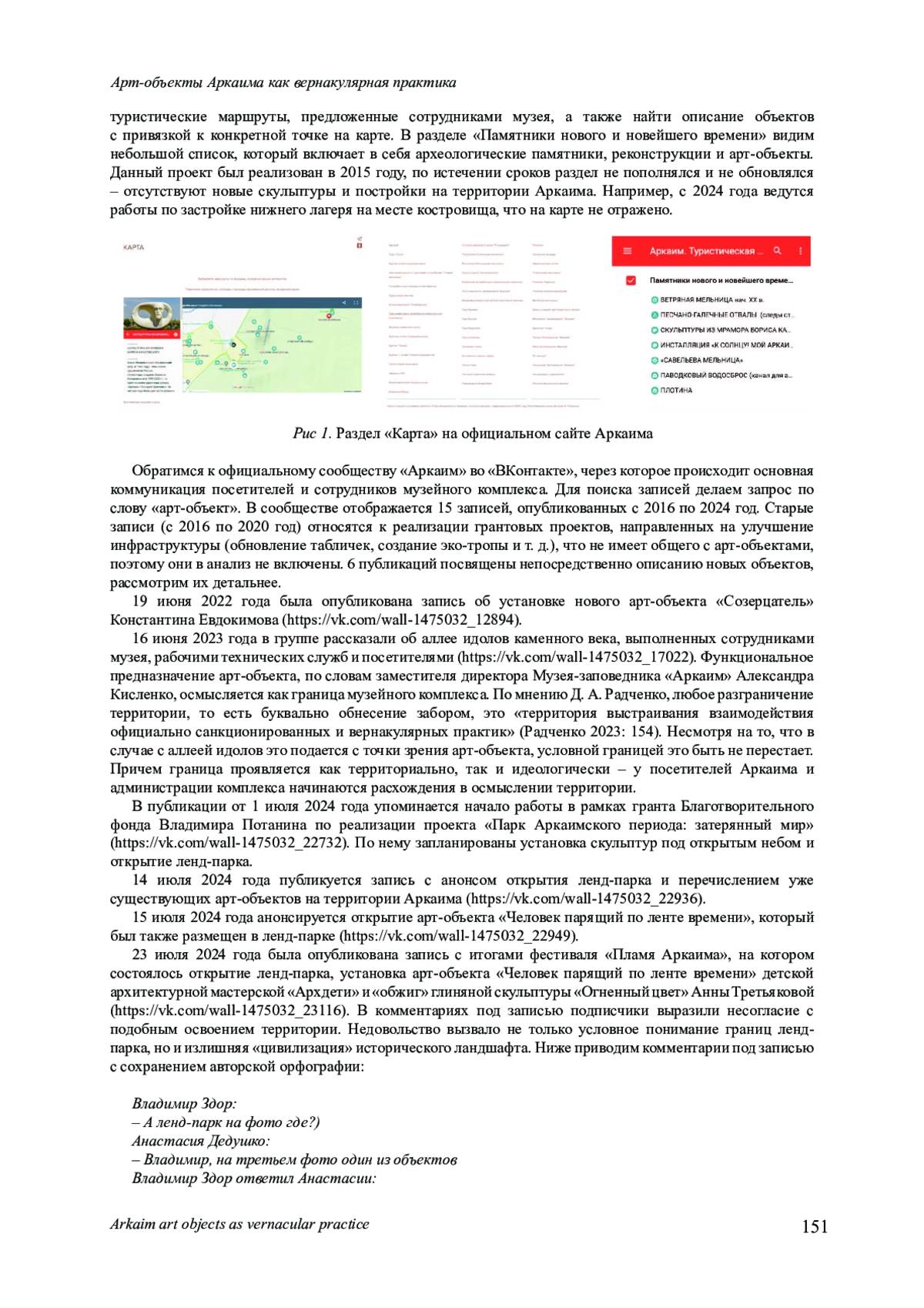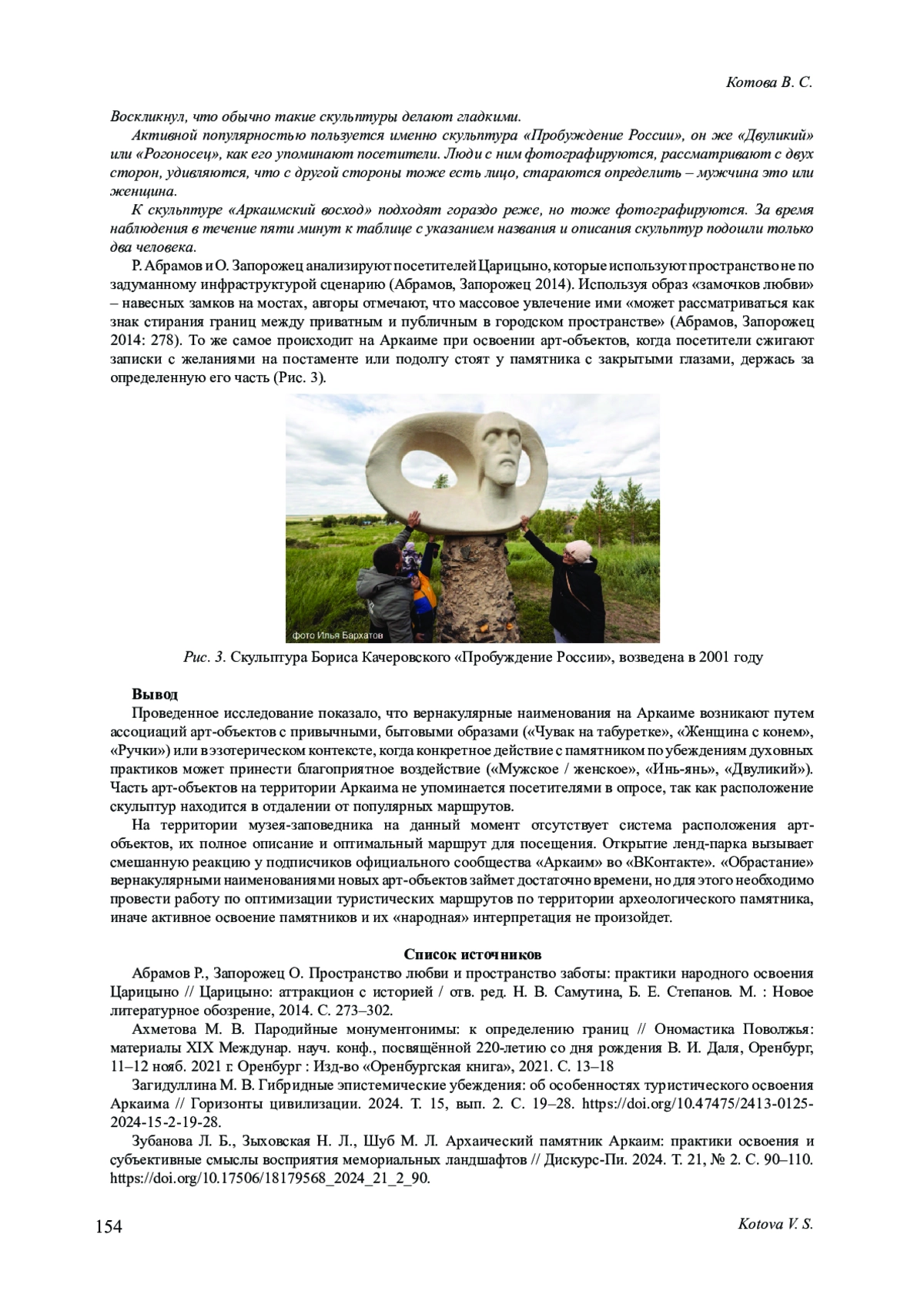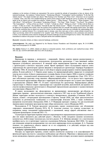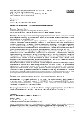 В статье представлено понятие вернакуляра, применимое для анализа «народных» названий арт-объектов на территории музея-заповедника Аркаим в Челябинской области, полученных во время экспедиций с мая по сентябрь 2024 года. Проанализировано 6 публикаций по запросу «арт-объект» в официальном сообществе «Аркаим» во ВКонтакте. Обобщены названия актуальных скульптур на территории Аркаима. При опросе выявлено отношение респондентов к четырем арт-объектам меморативного ландшафта - скульптурам «Аркаимский восход», «Пробуждение России», «Созерцатель» и инсталляции «К солнцу! Мой Аркаим (Анна)». В выборку включены новые объекты «Человек парящий по ленте времени» и «Огненный цвет», которые еще не обрели«народное» наименование, так как установлены во время текущего туристического сезона 2024 года. При опросе посетителей зафиксированы вернакулярные наименования арт-объектов: скульптура«Аркаимский восход» - «Белая женщина», «Лошадка», «Белая скульптура», «Девушка с конем», «Девушка и кони». Скульптура «Пробуждение России» - «Инь-янь», «Мужское / женское», «Двуликий». Скульптура«Созерцатель» - «Железяка на табуретке», «Стульчик», «Чувак на табуретке», «Сидящий на стуле», «Мужик с луной на стуле», «Человек на стуле». Инсталляция «К солнцу! Мой Аркаим (Анна)» - «Ручки». Также выявлено, что остальные арт-объекты не пользуются популярностью у посетителей, так как расположение скульптур не совпадает с популярными туристическими маршрутами. Автор приходит к выводу, что арт-объекты носят сакральный характер для посетителей, но вернакулярное наименование не идет вразрез с осмыслением памятника как духовного элемента. Для возникновения вернакулярного наименования должно пройти некоторое количество времени, чтобы сложилось определенное отношение к арт-объекту, которое будет транслироваться в «народном» названии. При анализе публикаций в сообществе и комментариев к ним, установлено, что действия, направленные на изменение меморативного ландшафта, воспринимаются посетителями неоднозначно. Данное отношение в том числе транслируется в отношении проекта по созданию ленд-парка и первых установленных скульптур.