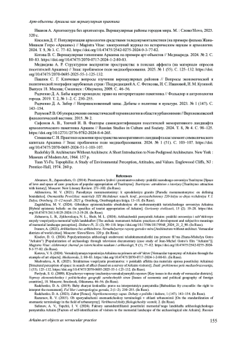 4. Зубанова Л. Б., Зыховская Н. Л., Шуб М. Л. Архаический памятник Аркаим: практики освоения и субъективные смыслы восприятия мемориальных ландшафтов // Дискурс-Пи. 2024. Т. 21, № 2. С. 90-110. DOI: 10.17506/18179568_2024_21_2_90 EDN: HAEYVE