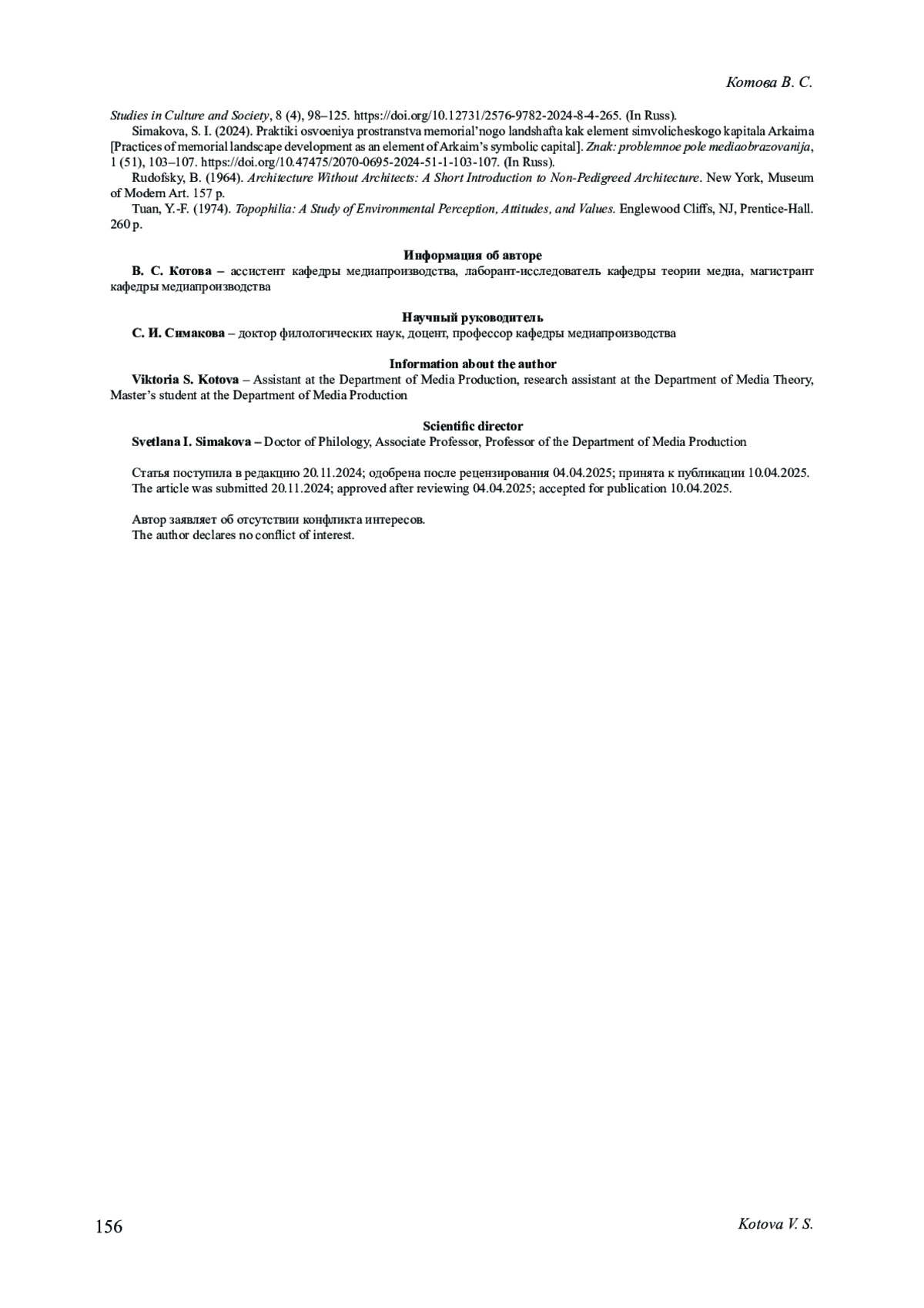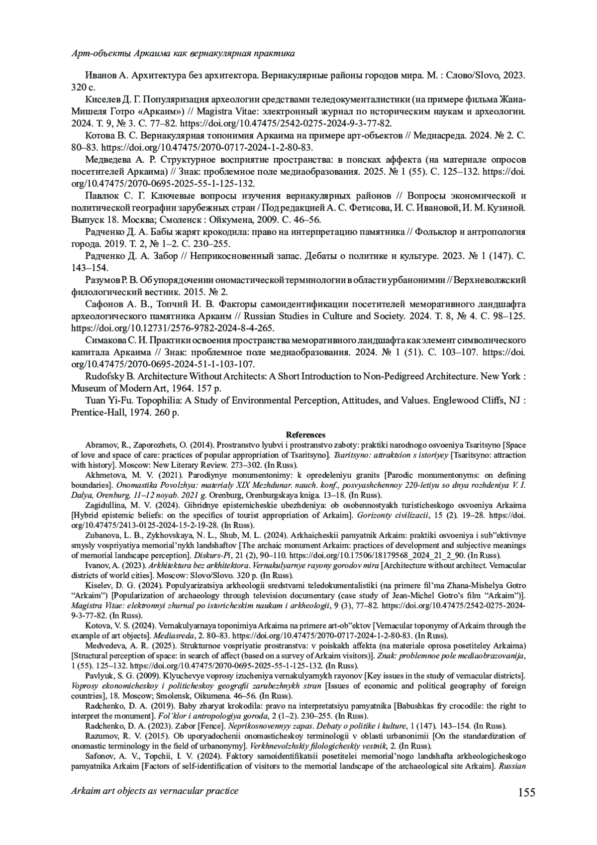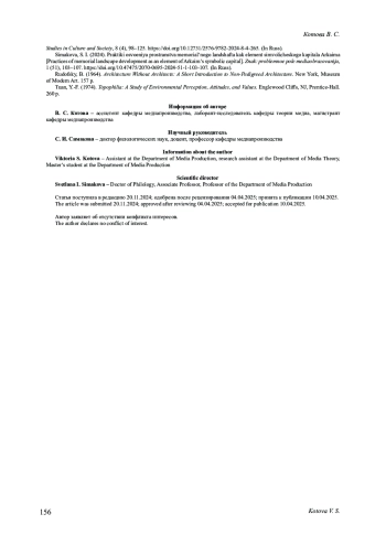 8. Медведева А. Р. Структурное восприятие пространства: в поисках аффекта (на материале опросов посетителей Аркаима) // Знак: проблемное поле медиаобразования. 2025. № 1 (55). С. 125-132. DOI: 10.47475/2070-0695-2025-55-1-125-132 EDN: YMYSLW