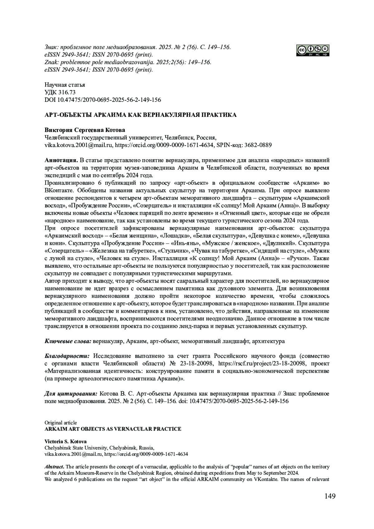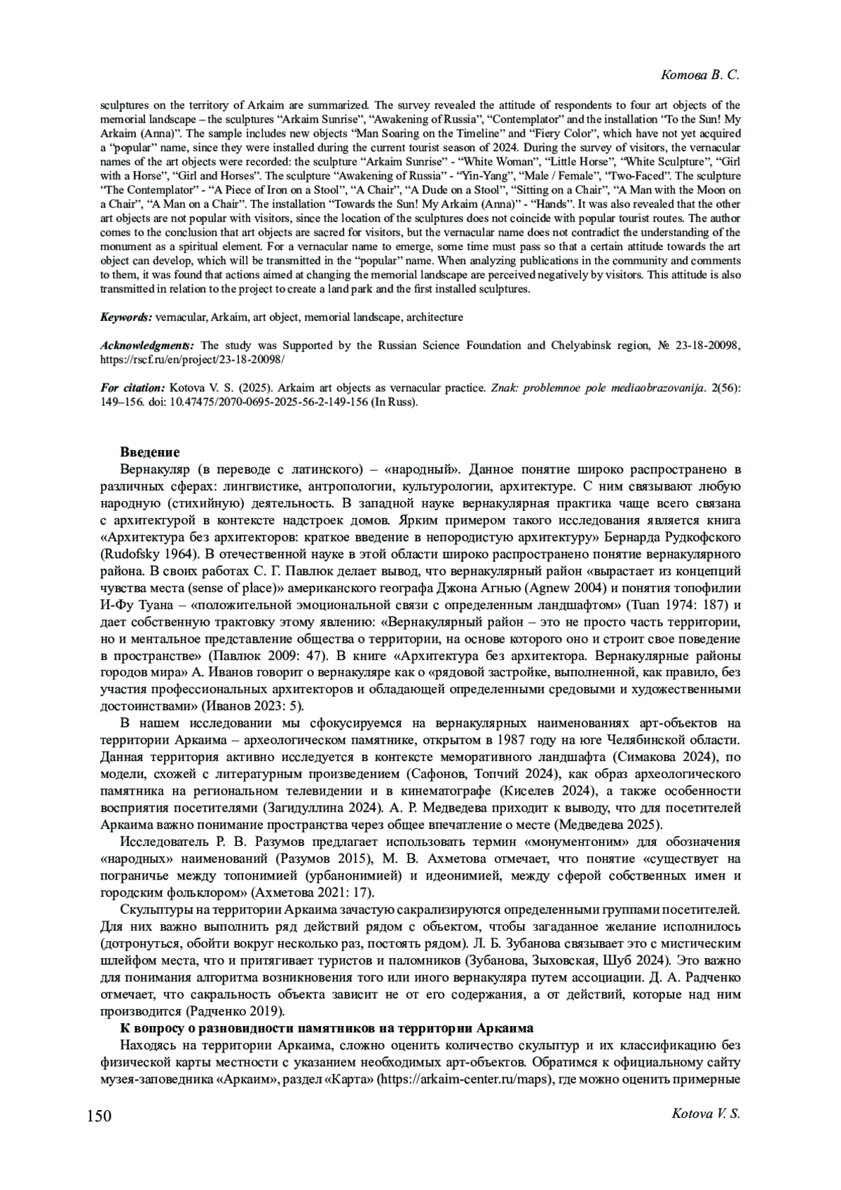 7. Котова В. С. Вернакулярная топонимия Аркаима на примере арт-объектов // Медиасреда. 2024. № 2. С. 80-83. DOI: 10.47475/2070-0717-2024-1-2-80-83 EDN: JOGXTI