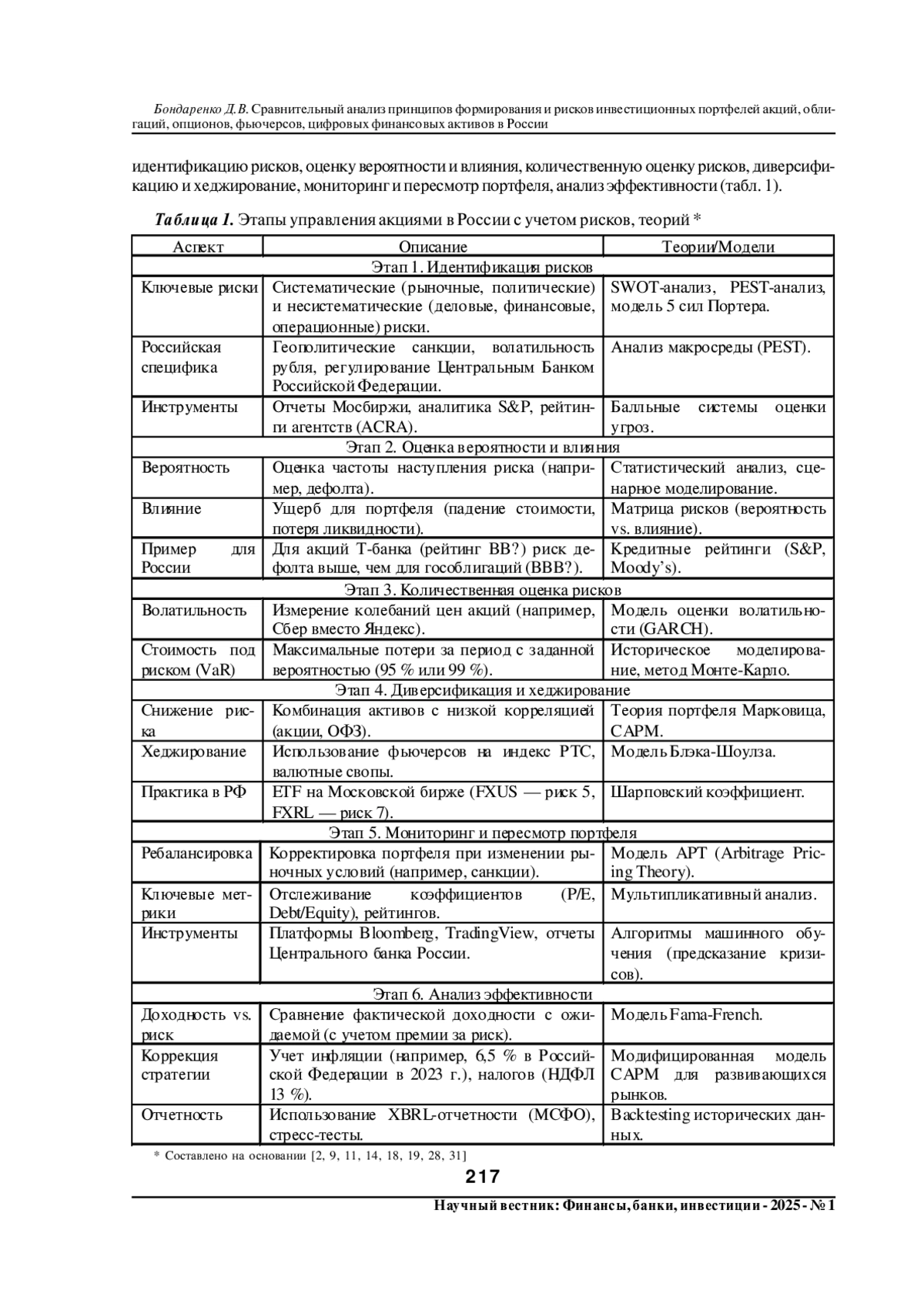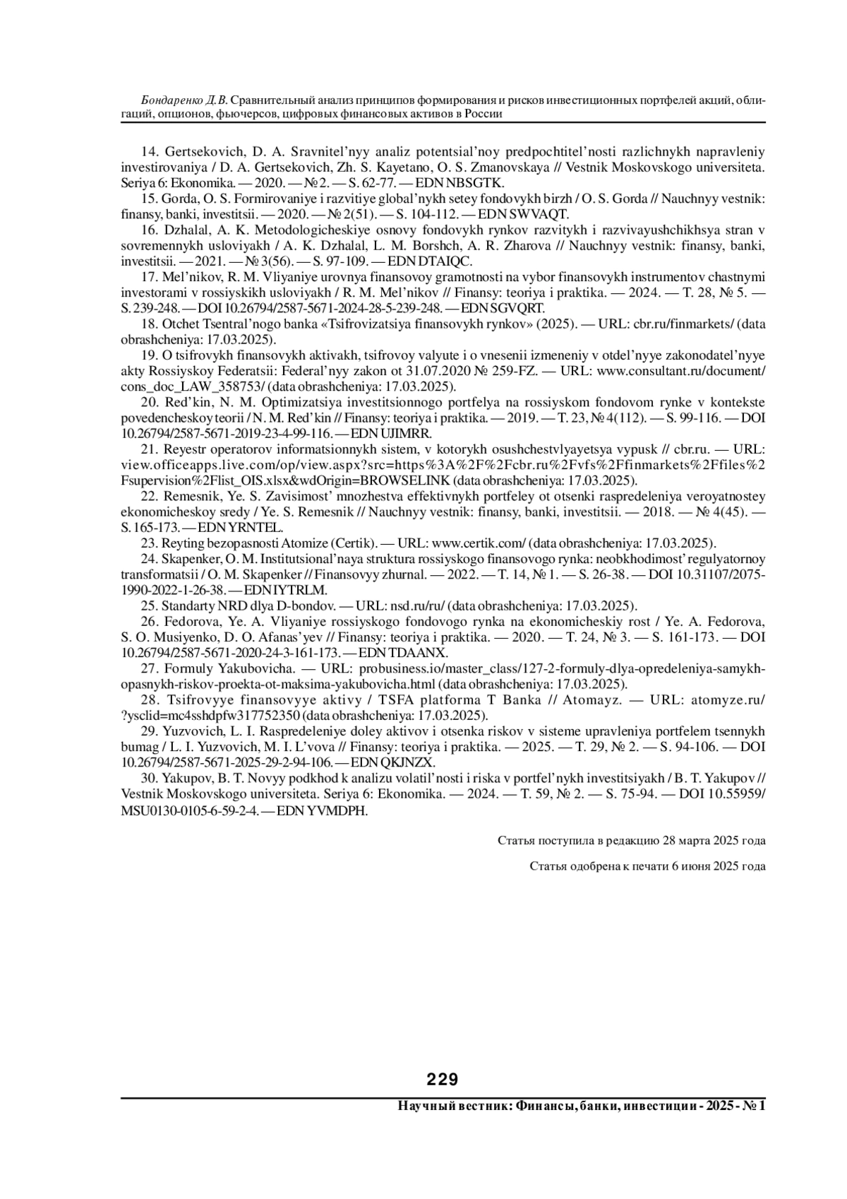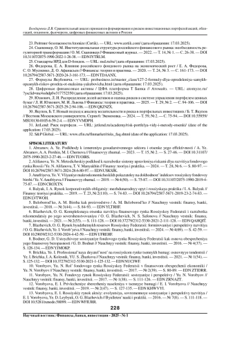 29. Юзвович, Л. И. Распределение долей активов и оценка рисков в системе управления портфелем ценных бумаг / Л. И. Юзвович, М. И. Львова // Финансы: теория и практика. - 2025. - Т. 29, № 2. - С. 94-106. DOI: 10.26794/2587-5671-2025-29-2-94-106 EDN: QKJNZX
