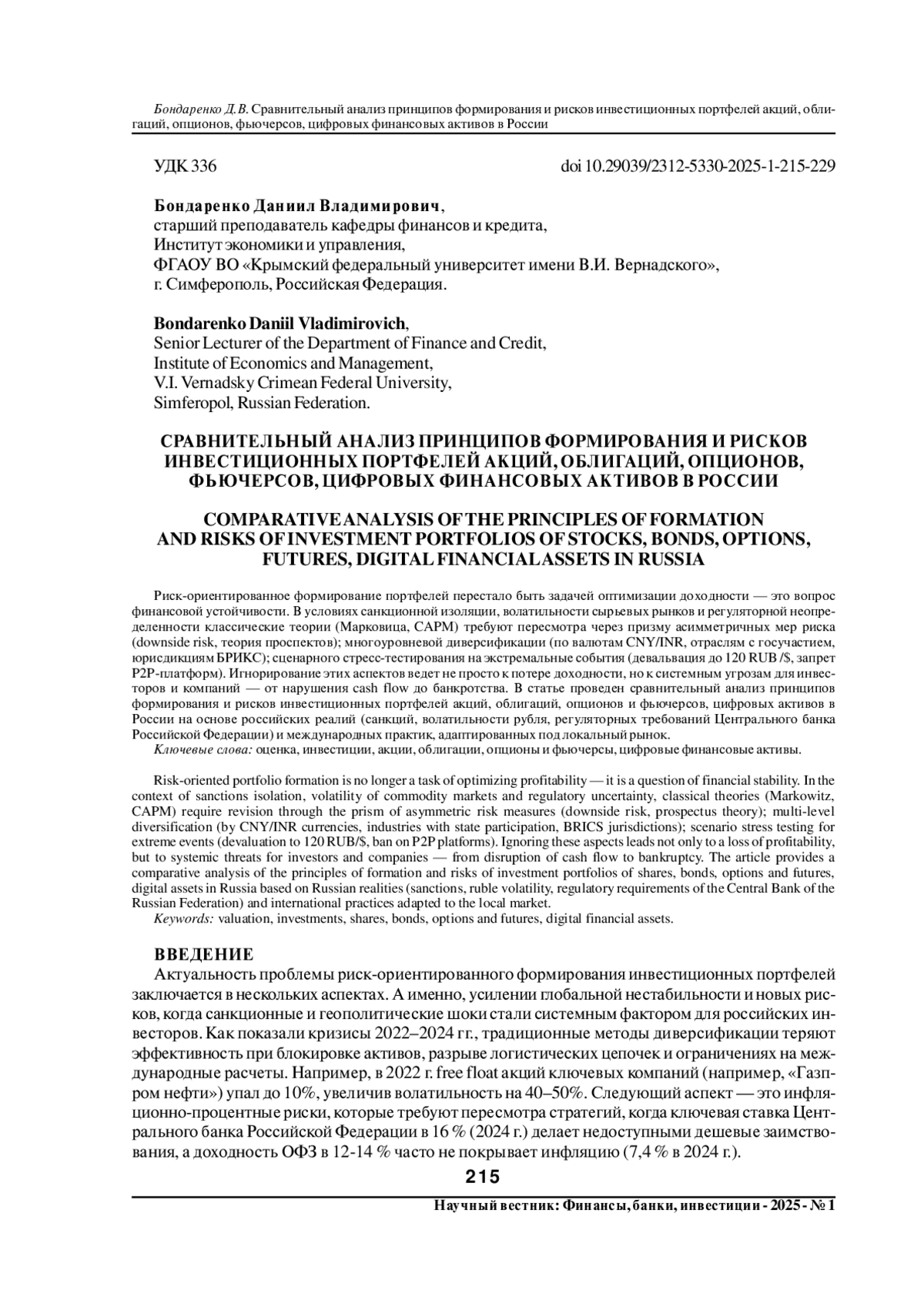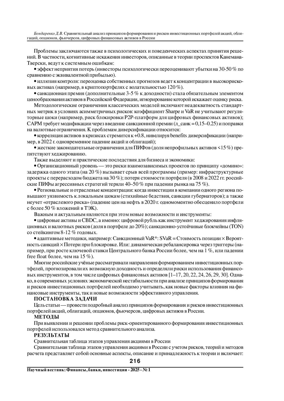Риск-ориентированное формирование портфелей перестало быть задачей оптимизации доходности - это вопрос финансовой устойчивости. В условиях санкционной изоляции, волатильности сырьевых рынков и регуляторной неопределенности классические теории (Марковица, CAPM) требуют пересмотра через призму асимметричных мер риска (downside risk, теория проспектов); многоуровневой диверсификации (по валютам CNY/INR, отраслям с госучастием, юрисдикциям БРИКС); сценарного стресс-тестирования на экстремальные события (девальвация до 120 RUB /$, запрет P2P-платформ). Игнорирование этих аспектов ведет не просто к потере доходности, но к системным угрозам для инвесторов и компаний - от нарушения cash flow до банкротства. В статье проведен сравнительный анализ принципов формирования и рисков инвестиционных портфелей акций, облигаций, опционов и фьючерсов, цифровых активов в России на основе российских реалий (санкций, волатильности рубля, регуляторных требований Центрального банка Российской Федерации) и международных практик, адаптированных под локальный рынок.