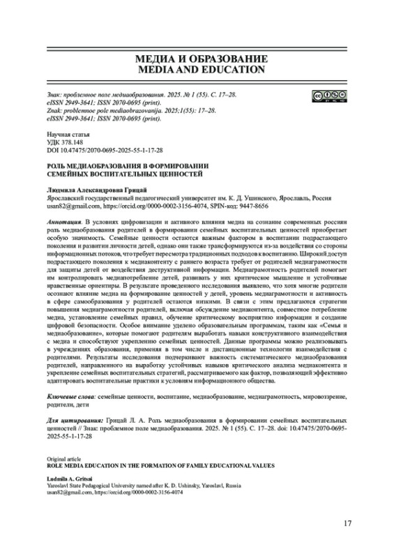 В условиях цифровизации и активного влияния медиа на сознание современных россиян роль медиаобразования родителей в формировании семейных воспитательных ценностей приобретает особую значимость. Семейные ценности остаются важным фактором в воспитании подрастающего поколения и развитии личности детей, однако они также трансформируются из-за воздействия со стороны информационных потоков, что требует пересмотра традиционных подходов к воспитанию. Широкий доступ подрастающего поколения к медиаконтенту с раннего возраста требует от родителей медиаграмотности для защиты детей от воздействия деструктивной информации. Медиаграмотность родителей помогает им контролировать медиапотребление детей, развивать у них критическое мышление и устойчивые нравственные ориентиры. В результате проведенного исследования выявлено, что хотя многие родители осознают влияние медиа на формирование ценностей у детей, уровень медиаграмотности и активность в сфере самообразования у родителей остаются низкими. В связи с этим предлагаются стратегии повышения медиаграмотности родителей, включая обсуждение медиаконтента, совместное потребление медиа, установление семейных правил, обучение критическому восприятию информации и создание цифровой безопасности. Особое внимание уделено образовательным программам, таким как «Семья и медиаобразование», которые помогают родителям выработать навыки конструктивного взаимодействия с медиа и способствуют укреплению семейных ценностей. Данные программы можно реализовывать в учреждениях образования, применяя в том числе и дистанционные технологии взаимодействия с родителями. Результаты исследования подчеркивают важность систематического медиаобразования родителей, направленного на выработку устойчивых навыков критического анализа медиаконтента и укрепление семейных воспитательных стратегий, рассматриваемого как фактор, позволяющий эффективно адаптировать воспитательные практики к условиям информационного общества.
