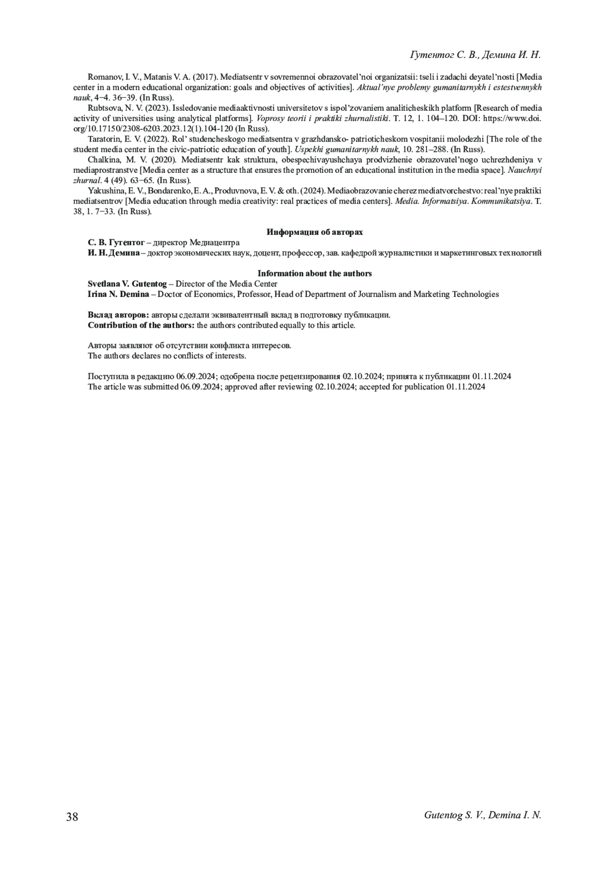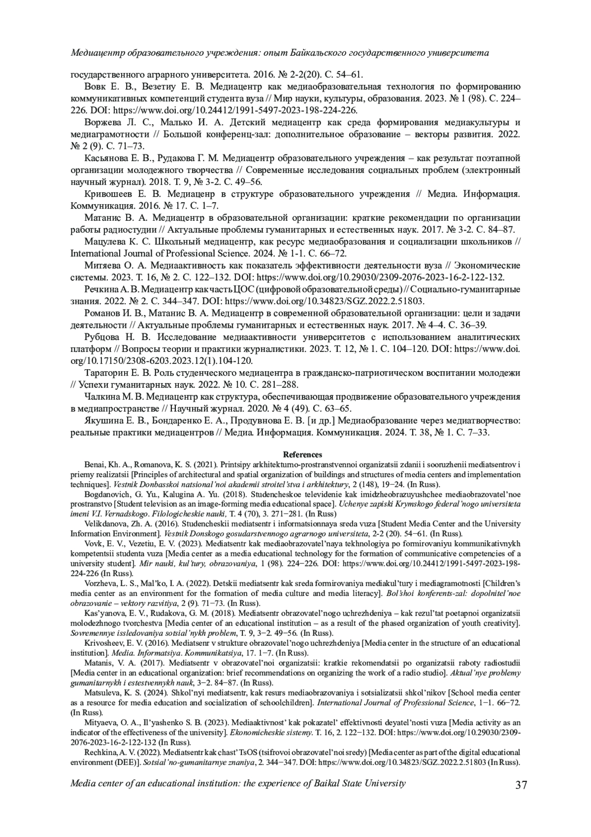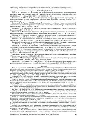 16. Якушина Е. В., Бондаренко Е. А., Продувнова Е. В. [и др.] Медиаобразование через медиатворчество: реальные практики медиацентров // Медиа. Информация. Коммуникация. 2024. Т. 38, № 1. С. 7-33. EDN: EJGDME