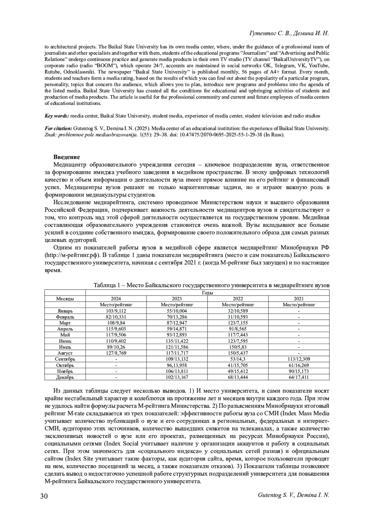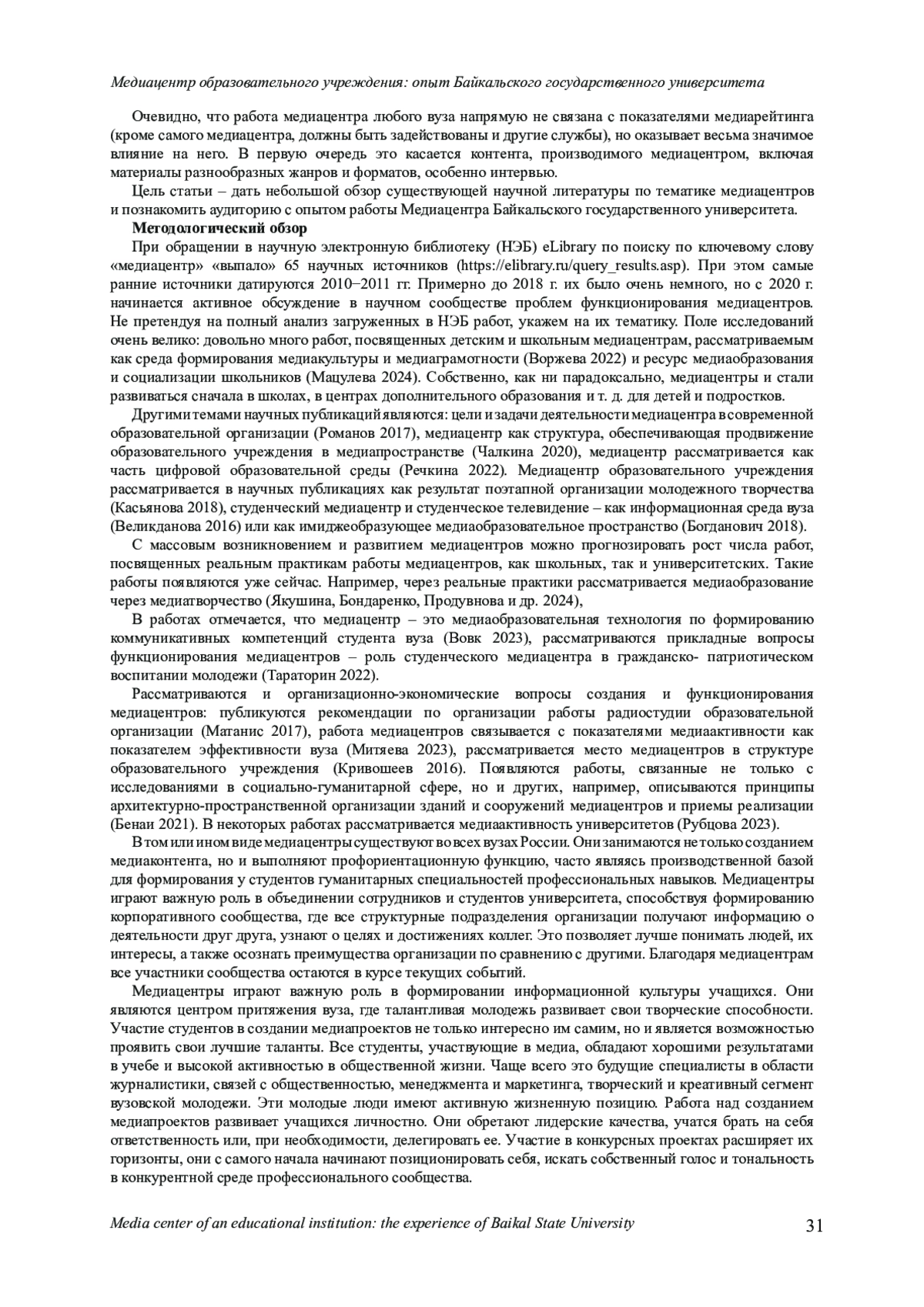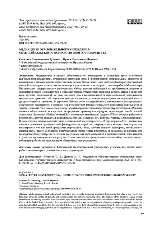 Медиацентры в каждом образовательном учреждении в настоящее время становятся важными подразделениями, играющими ключевую роль в формировании медиакультуры студентов и школьников и выполняющими маркетинговые задачи. Цель статьи - дать небольшой обзор существующей научной литературы по тематике медиацентров и познакомить аудиторию с опытом работы Медиацентра Байкальского государственного университета. Обзор научных публикаций по проблематике создания и функционирования медиацентров в образовательных учреждениях позволил сделать вывод о широком поле научных исследований: от роли медиацентров в воспитательной и образовательной деятельности организации, практики этой стороны ее функционирования, до междисциплинарных исследований, вплоть до архитектурных проектов. В структуре Байкальского государственного университета функционирует собственный медиацентр, в котором под руководством профессионального коллектива журналистов и других специалистов и совместно с ними студенты образовательных программ «Журналистика» и «Реклама и связи с общественностью» проходят непрерывную практику и генерируют медиапродукт в собственной телестудии (Телеканал «БайкалУниверТВ»), на корпоративном радио (радио «БУМ»), которые работают в режиме 24/7, ведутся аккаунты в социальных сетях ОК, Телеграм, ВК, YouTube, RuTube, «Одноклассники». В ежемесячном режиме выходит газета «Байкальский госуниверситет», 56 стр. формата А4+. Ежемесячно силами студентов и преподавателей формируется медиарейтинг, по результатам которого можно узнать о популярности той или иной программы, персоналии, темах, которые волнуют аудиторию, что позволяет спланировать, ввести в повестку перечисленных медиа новые программы и проблемы. В Байкальском государственном университете созданы все условия для образовательной и воспитательной деятельности студентов и производства медиапродукта. Статья полезна для профессионального сообщества и настоящих и будущих работников медиацентров образовательных учреждений.