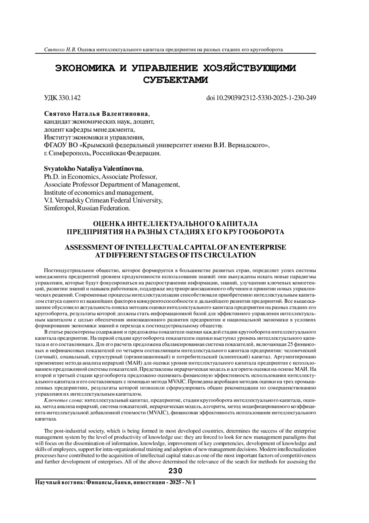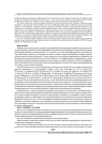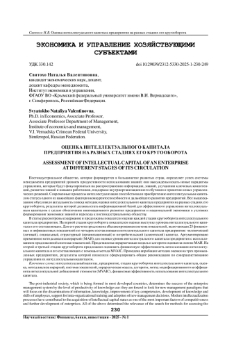 Постиндустриальное общество, которое формируется в большинстве развитых стран, определяет успех системы менеджмента предприятий уровнем продуктивности использования знаний: они вынуждены искать новые парадигмы управления, которые будут фокусироваться на распространении информации, знаний, улучшении ключевых компетенций, развитии знаний и навыков работников, поддержке внутриорганизационного обучения и принятии новых управленческих решений. Современные процессы интеллектуализации способствовали приобретению интеллектуальным капиталом статуса одного из важнейших факторов конкурентоспособности и дальнейшего развития предприятий. Все вышесказанное обусловило актуальность поиска методик оценки интеллектуального капитала предприятия на разных стадиях его кругооборота, результаты которой должны стать информационной базой для эффективного управления интеллектуальным капиталом с целью обеспечения инновационного развития предприятия и национальной экономики в условиях формирования экономики знаний и перехода к постиндустриальному обществу. В статье рассмотрены содержание и предложены показатели оценки каждой стадии кругооборота интеллектуального капитала предприятия. На первой стадии кругооборота показателем оценки выступил уровень интеллектуального капитала и его составляющих. Для его расчета предложена сбалансированная система показателей, включающая 25 финансовых и нефинансовых показателей по четырем составляющим интеллектуального капитала предприятия: человеческий (личный), социальный, структурный (организационный) и потребительский (клиентский) капитал. Аргументировано применение метода анализа иерархий (МАИ) для оценки уровня интеллектуального капитала предприятия с использованием предложенной системы показателей. Представлены иерархическая модель и алгоритм оценки на основе МАИ. На второй и третьей стадии кругооборота предложено оценивать финансовую эффективность использования интеллектуального капитала и его составляющих с помощью метода МVAIC. Проведена апробация методик оценки на трех промышленных предприятиях, результаты которой позволили сформулировать общие рекомендации по совершенствованию управления их интеллектуальным капиталом.