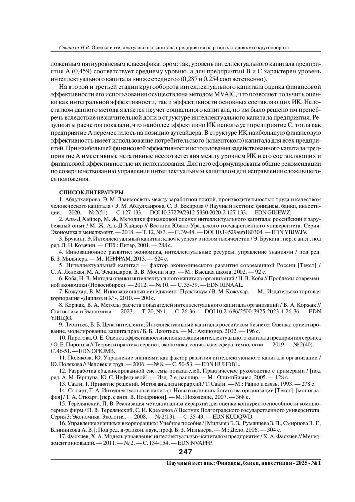 2. Аль-Д Хайдер, М. Ж. Методики финансовой оценки интеллектуального капитала: российский и зарубежный опыт / М. Ж. Аль-Д Хайдер // Вестник Южно-Уральского государственного университета. Серия: Экономика и менеджмент. - 2018. - Т. 12, № 3. - С. 39-48. DOI: 10.14529/em180304 EDN: YBJWJV
