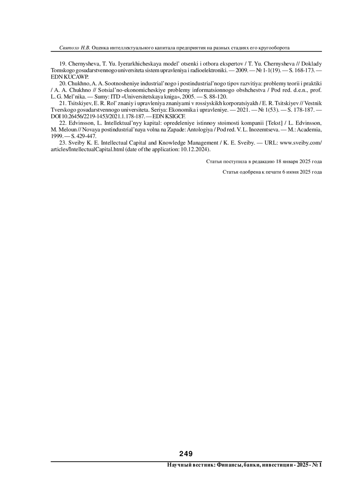 22. Эдвинссон, Л. Интеллектуальный капитал: определение истинной стоимости компании [Текст] / Л. Эдвинссон, М. Мэлоун // Новая постиндустриальная волна на Западе: Антология / Под ред. В. Л. Иноземцева. - М.: Academia, 1999. - С. 429-447.