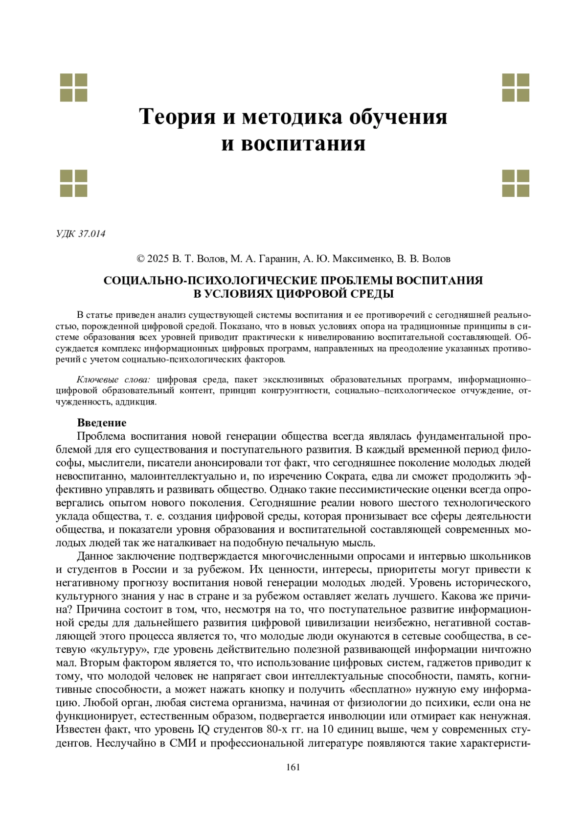 Проблема воспитания новой генерации общества всегда являлась фундаментальной проблемой для его существования и поступательного развития. В каждый временной период философы, мыслители, писатели анонсировали тот факт, что сегодняшнее поколение молодых людей невоспитанно, малоинтеллектуально и, по изречению Сократа, едва ли сможет продолжить эффективно управлять и развивать общество. Однако такие пессимистические оценки всегда опровергались опытом нового поколения. Сегодняшние реалии нового шестого технологического уклада общества, т. е. создания цифровой среды, которая пронизывает все сферы деятельности общества, и показатели уровня образования и воспитательной составляющей современных молодых людей так же наталкивает на подобную печальную мысль.