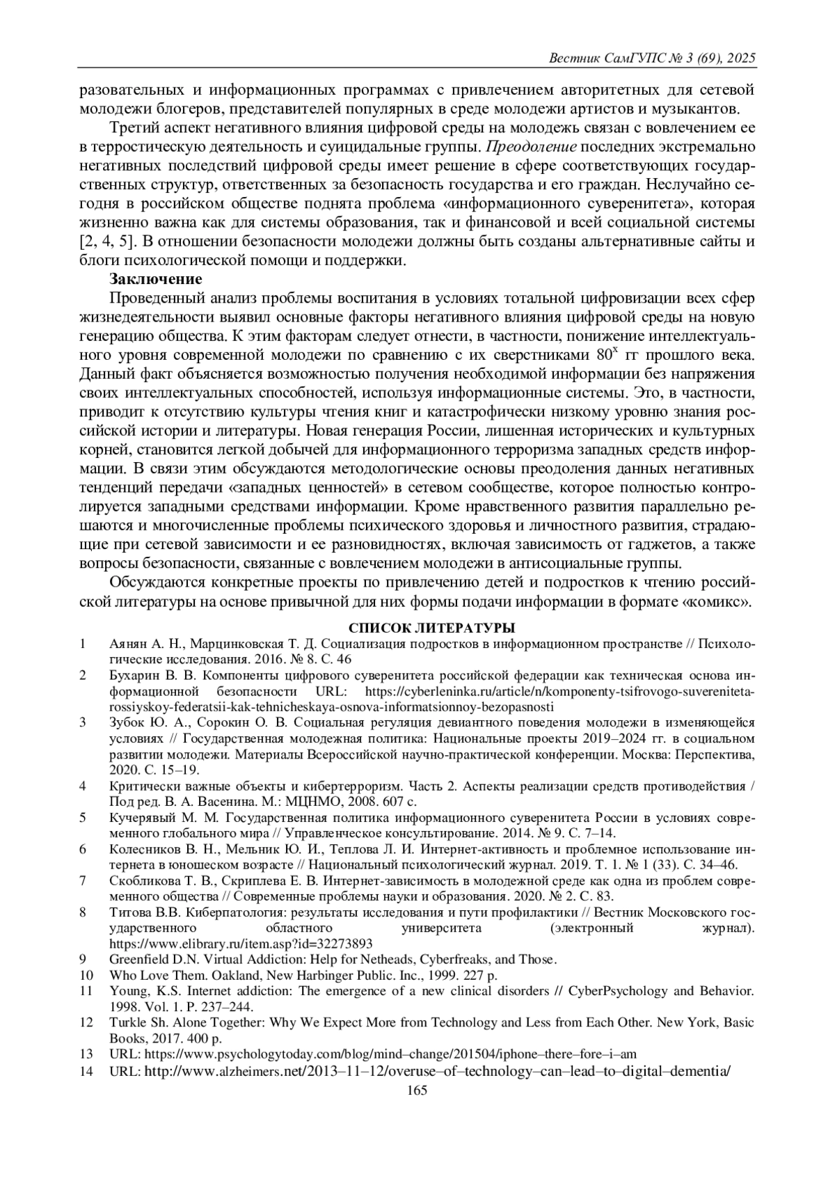 8. Титова В.В. Киберпатология: результаты исследования и пути профилактики / Вестник Московского государственного областного университета (электронный журнал). https://www.elibrary.ru/item.asp?id=32273893.