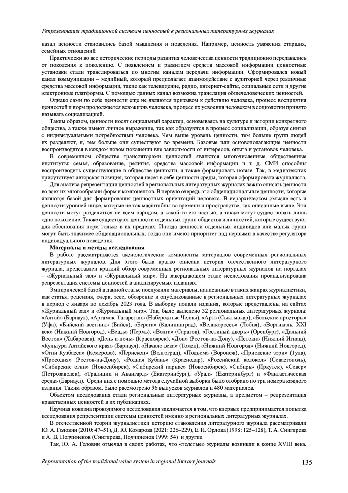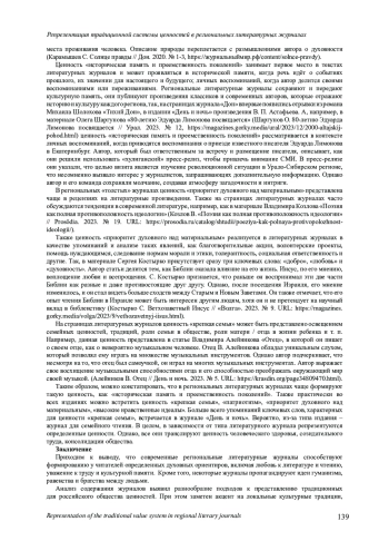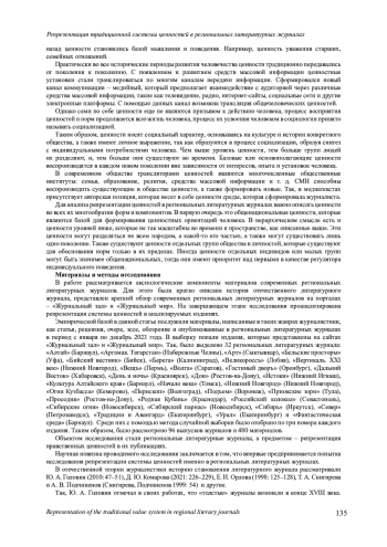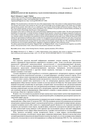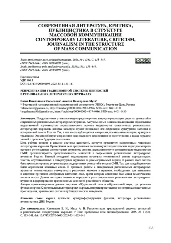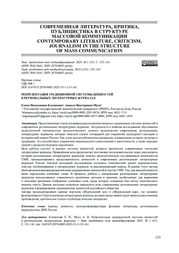 Представленная статья посвящена рассмотрению вопроса о реализации системы ценностей в современных региональных литературных журналах. Актуальность и новизна исследования обусловлены недостаточной изученностью аксиологического аспекта медиатекстов современных региональных литературных журналов, которые зачастую служат площадкой для сохранения культурного наследия и исторической памяти России. Так, в них всегда публикуются материалы, посвященные истории, культуре и традициям. Это способствует сохранению национального самосознания и идентичности, а также передаче знаний о прошлом будущим поколениям. Цель работы состоит в анализе системы ценностей, которую презентуют современным читателям литературные журналы. Приведённая цель предполагает постановку исследовательских задач: рассмотреть историю региональных литературных журналов; описать аксиологическую составляющую медиатекстов СМИ; проанализировать представленность ценностей в современных региональных литературных журналах России. Базовой методикой исследования послужил тематический анализ журналистских текстов, опубликованных в литературных журналах за рассматриваемый период. В рамках этого метода была проанализирована репрезентация традиционных ценностей в текстах СМИ. Так, для каждой ценности были определены ключевые слова. В процессе работы с материалами региональных литературных журналов использовалась совокупность различных методов и приемов, необходимых для выявления и описания признаков отобранных ключевых слов, среди которых основным был метод тематического анализа текста. Данная методика позволила определить роль современных региональных литературных журналов в формировании традиционных ценностей российского общества. Авторы проанализировали данные порталов «Журнальный зал» и «Журнальный мир», где успешно функционируют 32 региональных литературных журнала, которые представляют аудитории художественные произведения, критические статьи и публицистические материалы.