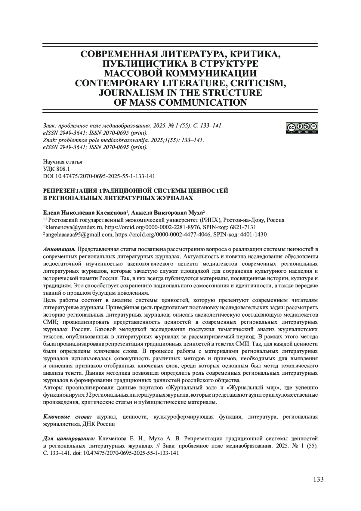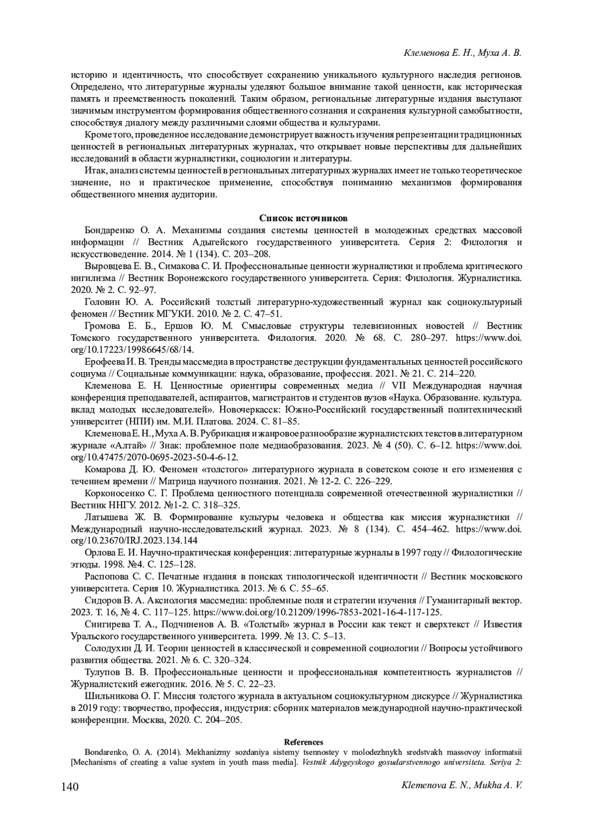 6. Клеменова Е. Н. Ценностные ориентиры современных медиа // VII Международная научная конференция преподавателей, аспирантов, магистрантов и студентов вузов “Наука. Образование. культура. вклад молодых исследователей”. Новочеркасск: Южно-Российский государственный политехнический университет (НПИ) им. М.И. Платова. 2024. С. 81-85. EDN: YXMNFM
