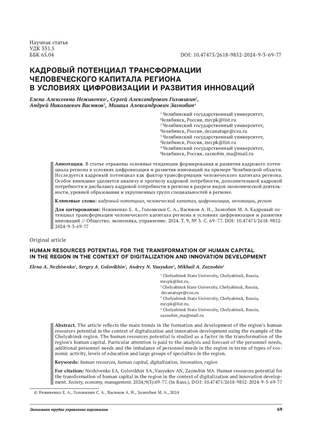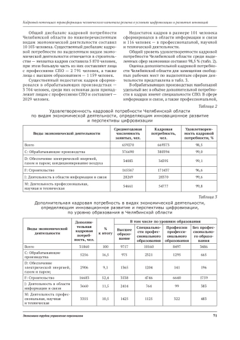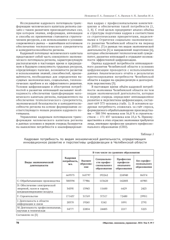В статье отражены основные тенденции формирования и развития кадрового потенциала региона в условиях цифровизации и развития инноваций на примере Челябинской области. Исследуется кадровый потенциал как фактор трансформации человеческого капитала региона. Особое внимание уделяется анализу и прогнозу кадровой потребности, дополнительной кадровой потребности и дисбалансу кадровой потребности в регионе в разрезе видов экономической деятельности, уровней образования и укрупненных групп специальностей в регионе.