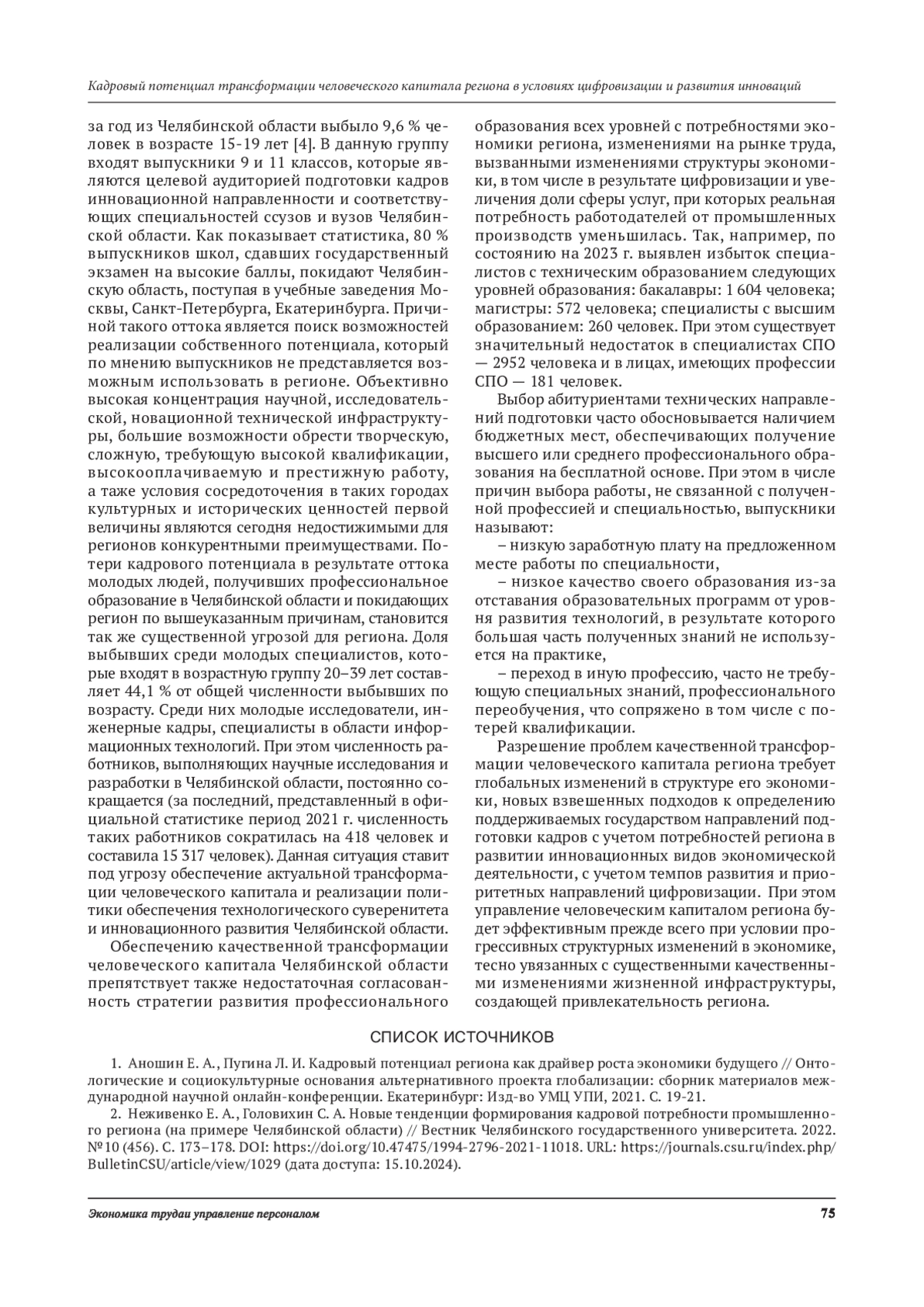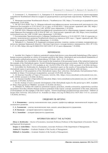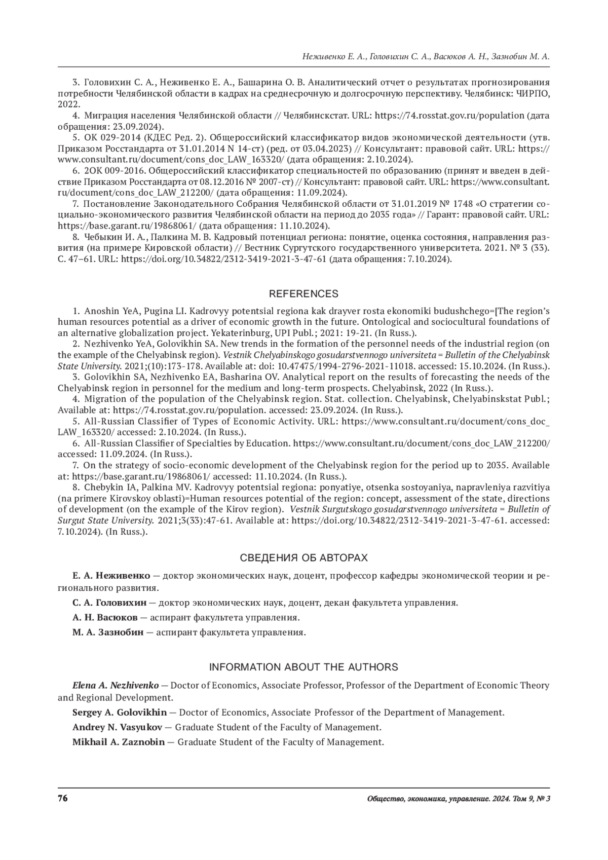 2. Неживенко Е. А., Головихин С. А. Новые тенденции формирования кадровой потребности промышленного региона (на примере Челябинской области) // Вестник Челябинского государственного университета. 2022. №10 (456). С. 173-178. 10.47475/1994-2796-2021-11018. URL: https://journals.csu.ru/index.php/BulletinCSU/article/view/1029 (дата доступа: 15.10.2024). DOI: 10.47475/1994-2796-2021-11018.URL