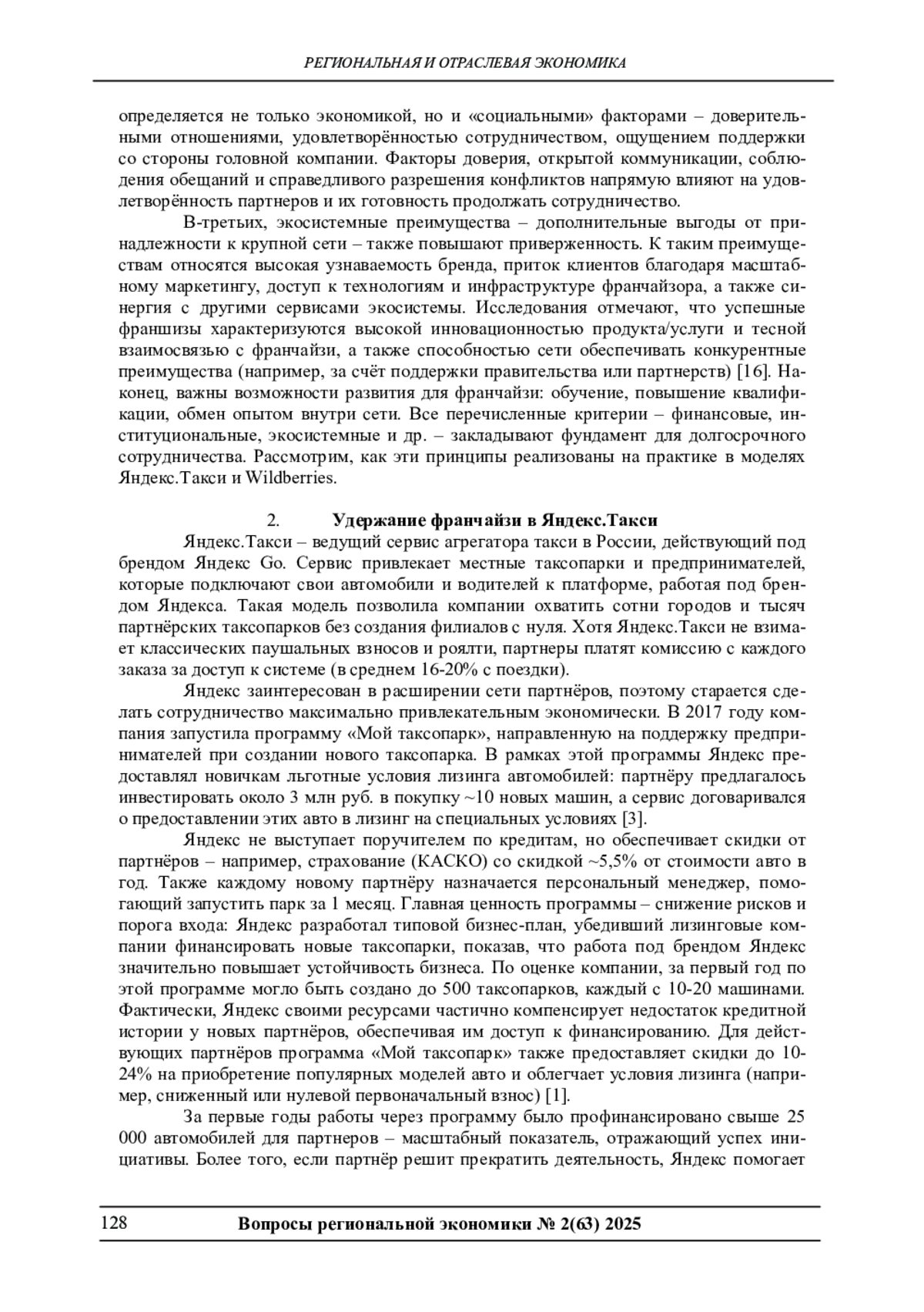 В статье рассматриваются практики удержания франчайзи на примере «Яндекс. Такси» и Wildberries, обеспечивающие высокую лояльность партнёров и стабильный рост сети. Анализируются финансовые стимулы, институциональная поддержка, маркетинговая и логистическая инфраструктура, а также факторы конфликта и его преодоления. Предложена экономическая модель удержания франчайзи, отражающая баланс между ROI, поддержкой франчайзера и альтернативными вариантами для предпринимателя. Выявлены ключевые метрики эффективности и условия долгосрочного сотрудничества. Материалы исследования полезны для учёных и практиков, разрабатывающих более устойчивые франчайзинговые модели.