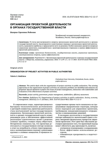 В статье рассматриваются вопросы организации проектной деятельности в органах государственной власти. Анализируются существующие подходы к организации проектной деятельности, выявляются проблемы и предлагаются пути их решения. Особое внимание уделяется вопросам управления проектами, взаимодействия с заинтересованными сторонами и оценки эффективности проектной деятельности.