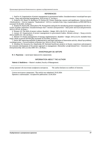 3. Еремин В. В., Котова Н. Е., Чернышева Т. К. Предпосылки и цели внедрения проектного управления в деятельность органов государственной власти // Государственная власть и местное самоуправление. 2022. № 1. С. 39-43. EDN: RONSOK