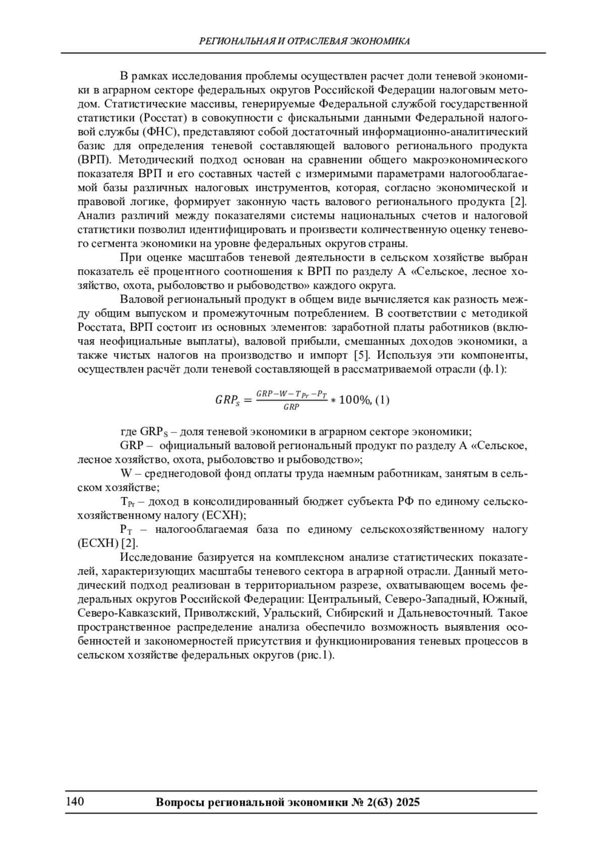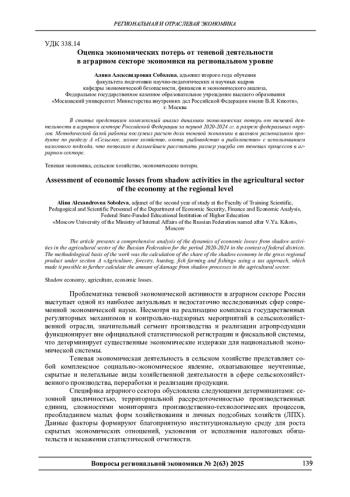 В статье представлен комплексный анализ динамики экономических потерь от теневой деятельности в аграрном секторе Российской Федерации за период 2020-2024 гг. в разрезе федеральных округов. Методической базой работы послужил расчет доли теневой экономики в валовом региональном продукте по разделу А «Сельское, лесное хозяйство, охота, рыбоводство и рыболовство» с использованием налогового подхода, что позволило в дальнейшем рассчитать размер ущерба от теневых процессов в аграрном секторе.