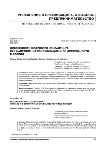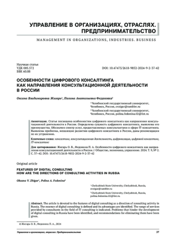Статья посвящена особенностям цифрового консалтинга как направления консультационной деятельности в России. Определена сущность цифрового консалтинга, выявлены его преимущества. Обозначен спектр услуг, предоставляемых консультантами в сфере IT-консалтинга. Выявлены проблемы, мешающие развитию цифрового консалтинга в России, даны рекомендации по их устранению.