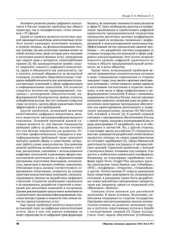 6. Соколова И. И., Абрамян К. А. К вопросу о проблемных аспектах рынка консалтинговых услуг в кризисных условиях //А-фактор: научные исследования и разработки (гуманитарные науки). 2021. V 4. URL: http://www.a-factor.ru/archive/item/166-tsifrovayatransformatsiya-globalnogo-rynka-uslug-konsaltinga-v-postkovidnykh-usloviyakh (дата обращения: 10.02.2024). EDN: ZDIYJD
