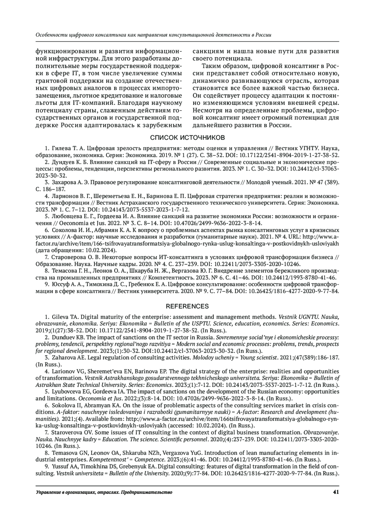 1. Гилева Т. А. Цифровая зрелость предприятия: методы оценки и управления // Вестник УГНТУ. Наука, образование, экономика. Серия: Экономика. 2019. V 1 (27). С. 38-52. DOI: 10.17122/2541-8904-2019-1-27-38-52