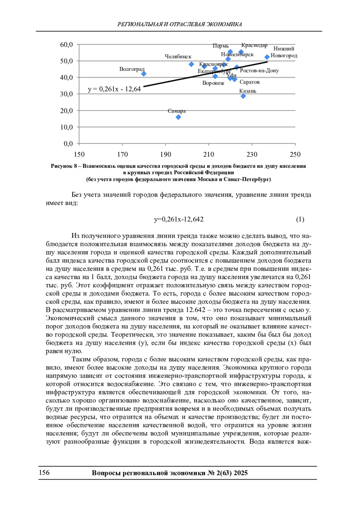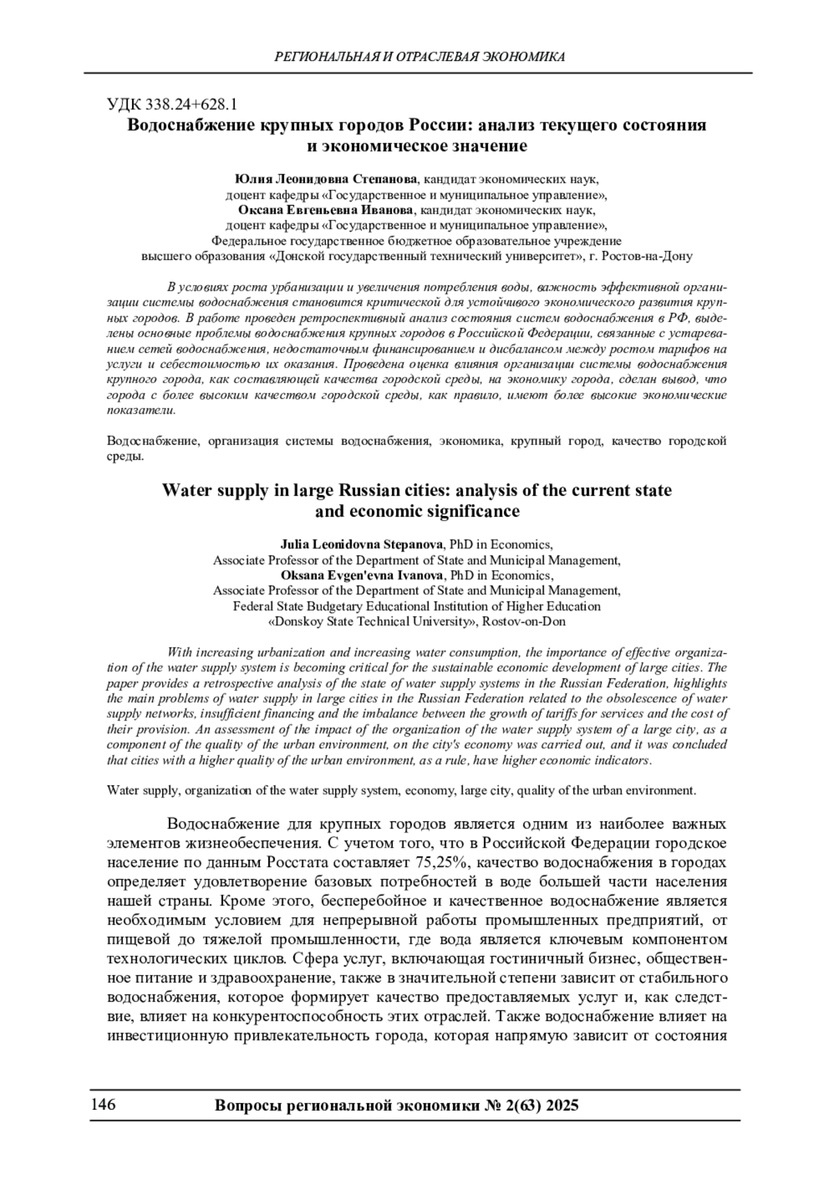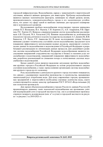 В условиях роста урбанизации и увеличения потребления воды, важность эффективной организации системы водоснабжения становится критической для устойчивого экономического развития крупных городов. В работе проведен ретроспективный анализ состояния систем водоснабжения в РФ, выделены основные проблемы водоснабжения крупных городов в Российской Федерации, связанные с устареванием сетей водоснабжения, недостаточным финансированием и дисбалансом между ростом тарифов на услуги и себестоимостью их оказания. Проведена оценка влияния организации системы водоснабжения крупного города, как составляющей качества городской среды, на экономику города, сделан вывод, что города с более высоким качеством городской среды, как правило, имеют более высокие экономические показатели.
