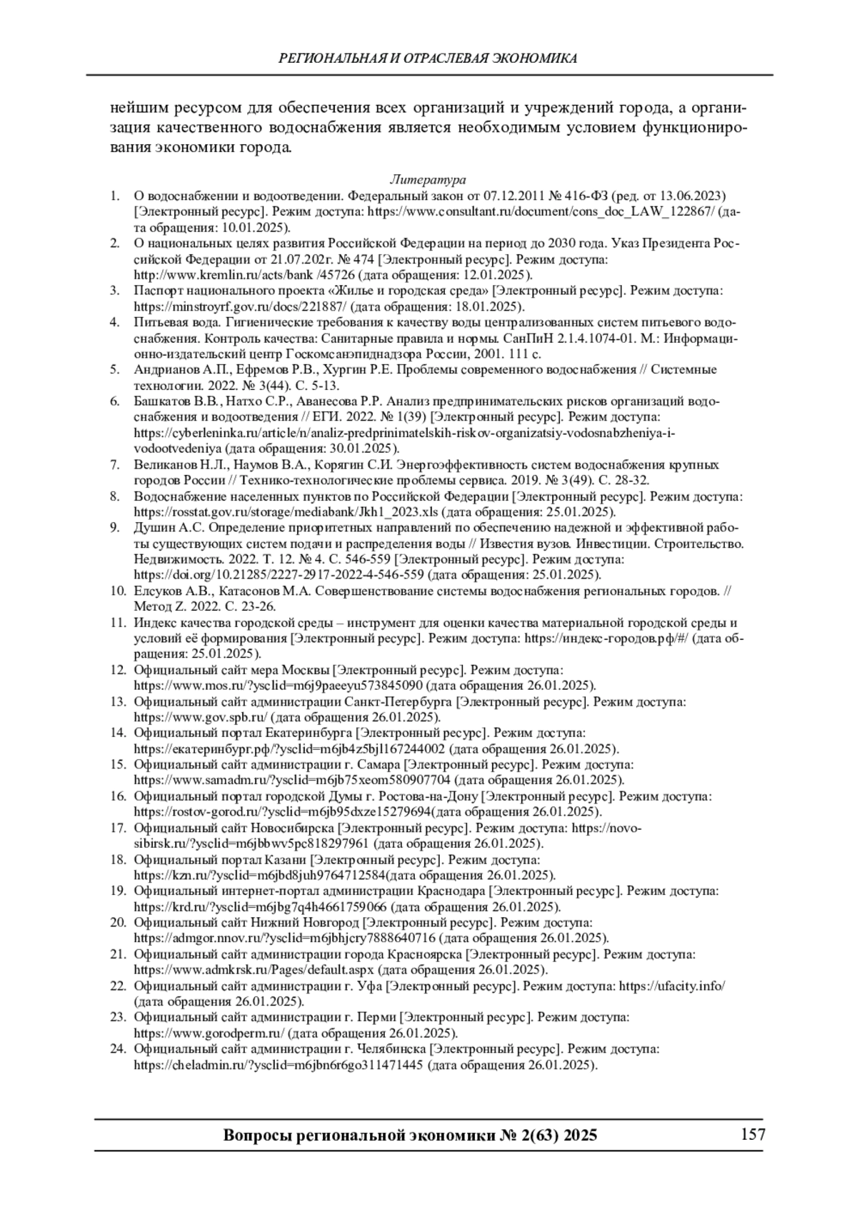 1. О водоснабжении и водоотведении. Федеральный закон от 07.12.2011 № 416-ФЗ (ред. от 13.06.2023) [Электронный ресурс]. Режим доступа: https://www.consultant.ru/document/cons_doc_LAW_122867/ (да-та обращения: 10.01.2025).