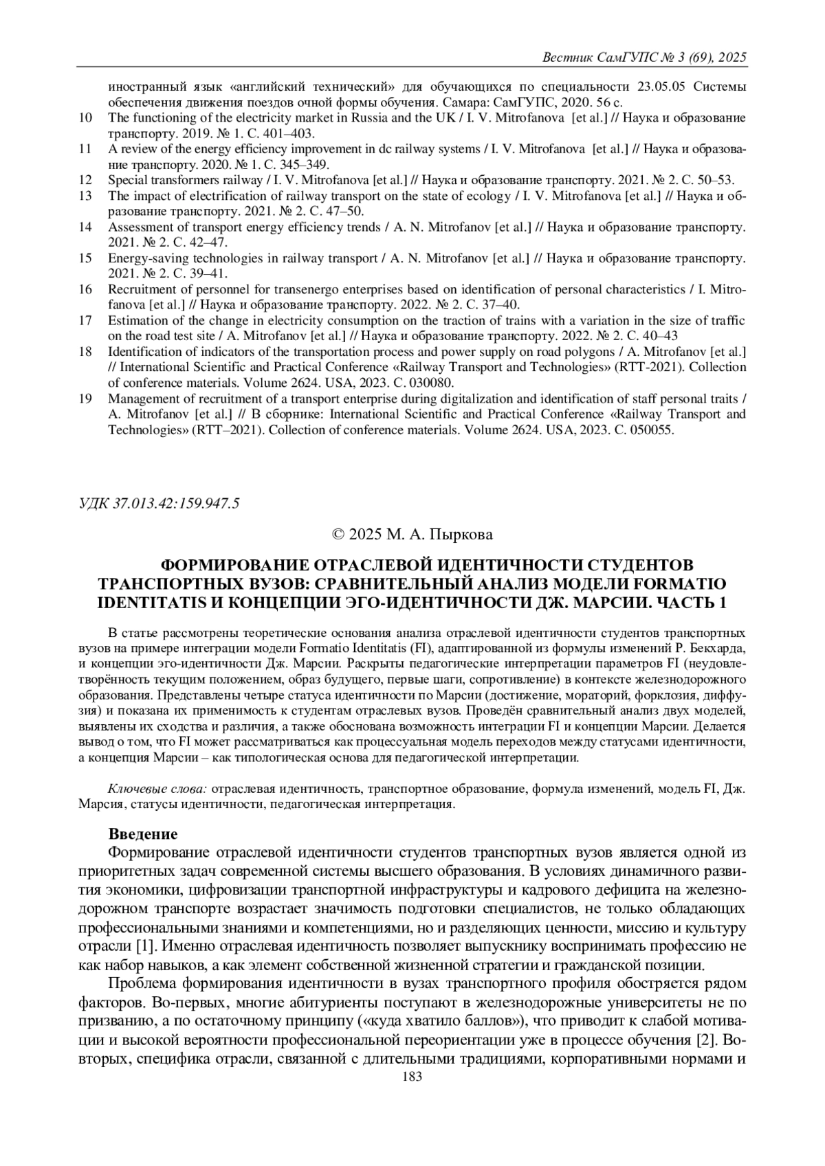 В статье рассмотрены теоретические основания анализа отраслевой идентичности студентов транспортных вузов на примере интеграции модели Formatio Identitatis (FI), адаптированной из формулы изменений Р. Бекхарда, и концепции эго - идентичности Дж. Марсии. Раскрыты педагогические интерпретации параметров FI (неудовлетворённость текущим положением, образ будущего, первые шаги, сопротивление) в контексте железнодорожного образования. Представлены четыре статуса идентичности по Марсии (достижение, мораторий, форклозия, диффузия) и показана их применимость к студентам отраслевых вузов. Проведён сравнительный анализ двух моделей, выявлены их сходства и различия, а также обоснована возможность интеграции FI и концепции Марсии. Делается вывод о том, что FI может рассматриваться как процессуальная модель переходов между статусами идентичности, а концепция Марсии - как типологическая основа для педагогической интерпретации.