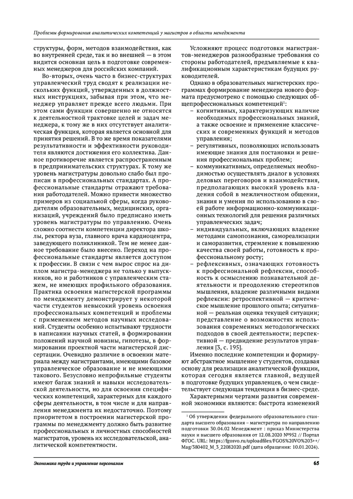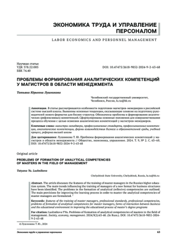 В статье рассматриваются особенности подготовки магистров-менеджеров в российской системе высшей школы. Выявлены основные тенденции, оказывающие влияние на подготовку руководителей нового форматке для бизнес-структур. Обозначены проблемы в формировании аналитических (рефлексивных) компетенций. Сформулированы основные положения для совершенствования процесса обучения с целью освоения аналитических компетенций у магистров-менеджеров.