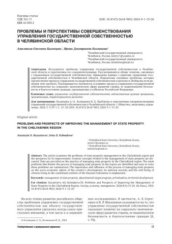 Исследуются проблемы управления государственной собственностью в Челябинской области и перспективы его совершенствования. Рассматриваются общие понятия, связанные с управлением государственной собственностью. Приведены данные о практике управления государственной собственностью в Челябинской области. Определены основные проблемы, которые препятствуют процессу управления государственной собственностью в регионе и обобщены пути решения этих проблем. Подчеркивается значимость и влияние процесса управления государственной собственностью на социально-экономическую сферу развития страны, ее национальную безопасность и благосостояние граждан, проживающих в субъектах Российской Федерации.