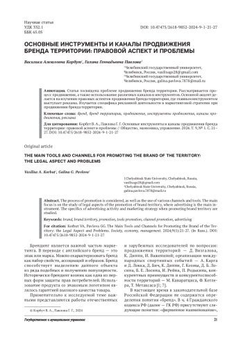 Статья: ОСНОВНЫЕ ИНСТРУМЕНТЫ И КАНАЛЫ ПРОДВИЖЕНИЯ БРЕНДА ТЕРРИТОРИИ: ПРАВОВОЙ АСПЕКТ И ПРОБЛЕМЫ (2024)