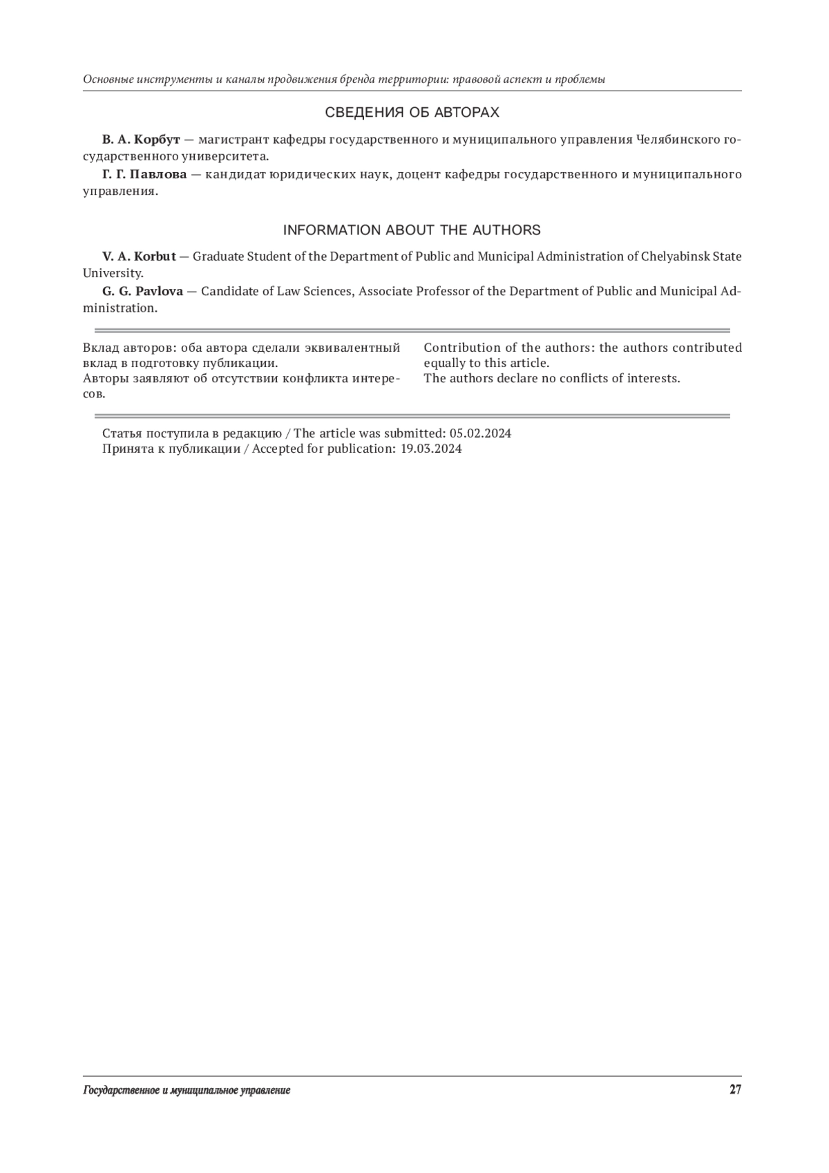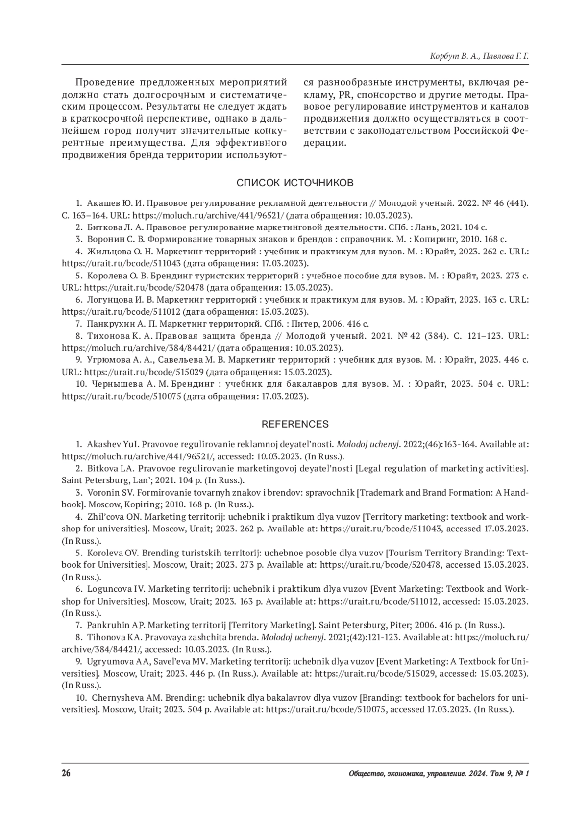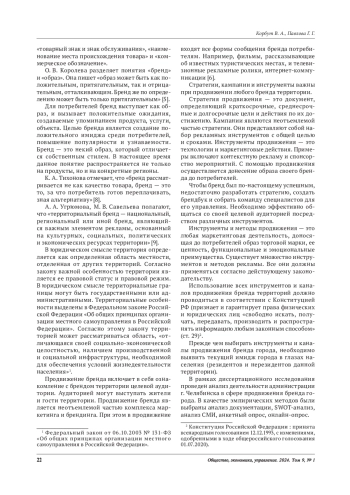 КОРБУТ В.А., ПАВЛОВА Г. Г. ОСНОВНЫЕ ИНСТРУМЕНТЫ И КАНАЛЫ ПРОДВИЖЕНИЯ БРЕНДА ТЕРРИТОРИИ: ПРАВОВОЙ АСПЕКТ И ПРОБЛЕМЫ // ОБЩЕСТВО, ЭКОНОМИКА, УПРАВЛЕНИЕ. 2024. Т. 9 № 1 (12 СТ.)
