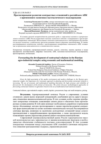 В условиях высокой неопределённости рыночной среды и современных вызовов в агропромышленном комплексе (АПК) России возрастает значение системного подхода к планированию и прогнозированию контрактных отношений. Использование экономико-математического моделирования обуславливает высокую точность и надёжность прогнозов развития данного формата взаимодействия. В статье рассматриваются методические подходы к прогнозированию контрактных отношений в АПК, основанные на применении математического и статистического анализа.