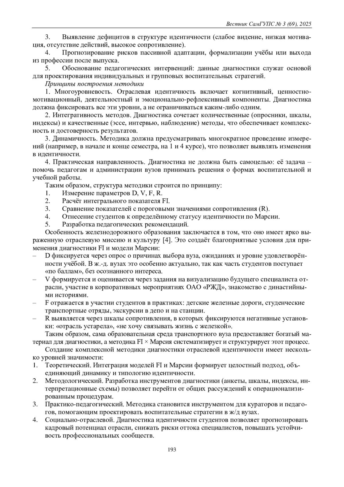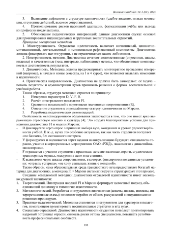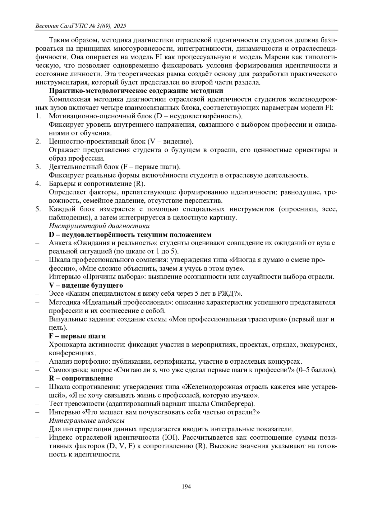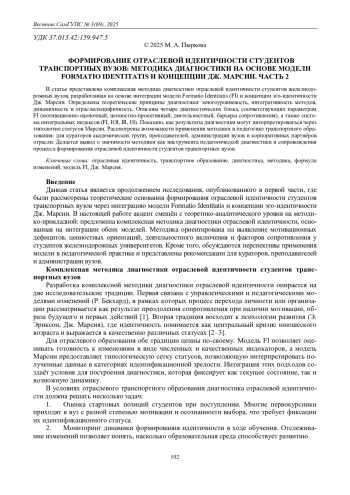 Данная статья является продолжением исследования, опубликованного в первой части, где были рассмотрены теоретические основания формирования отраслевой идентичности студентов транспортных вузов через интеграцию модели FШЫЦКЭТШ IНОЧЭТЭКЭТЬ и концепции эгоидентичности Дж. Марсии. В настоящей работе акцент смещён с теоретико-аналитического уровня на методико-прикладной: предложена комплексная методика диагностики отраслевой идентичности, основанная на интеграции обеих моделей. Методика ориентирована на выявление мотивационных дефицитов, ценностных ориентаций, деятельностного включения и факторов сопротивления у студентов железнодорожных университетов. Кроме того, обсуждаются перспективы применения модели в педагогической практике и представлены рекомендации для кураторов, преподавателей и администрации вузов.