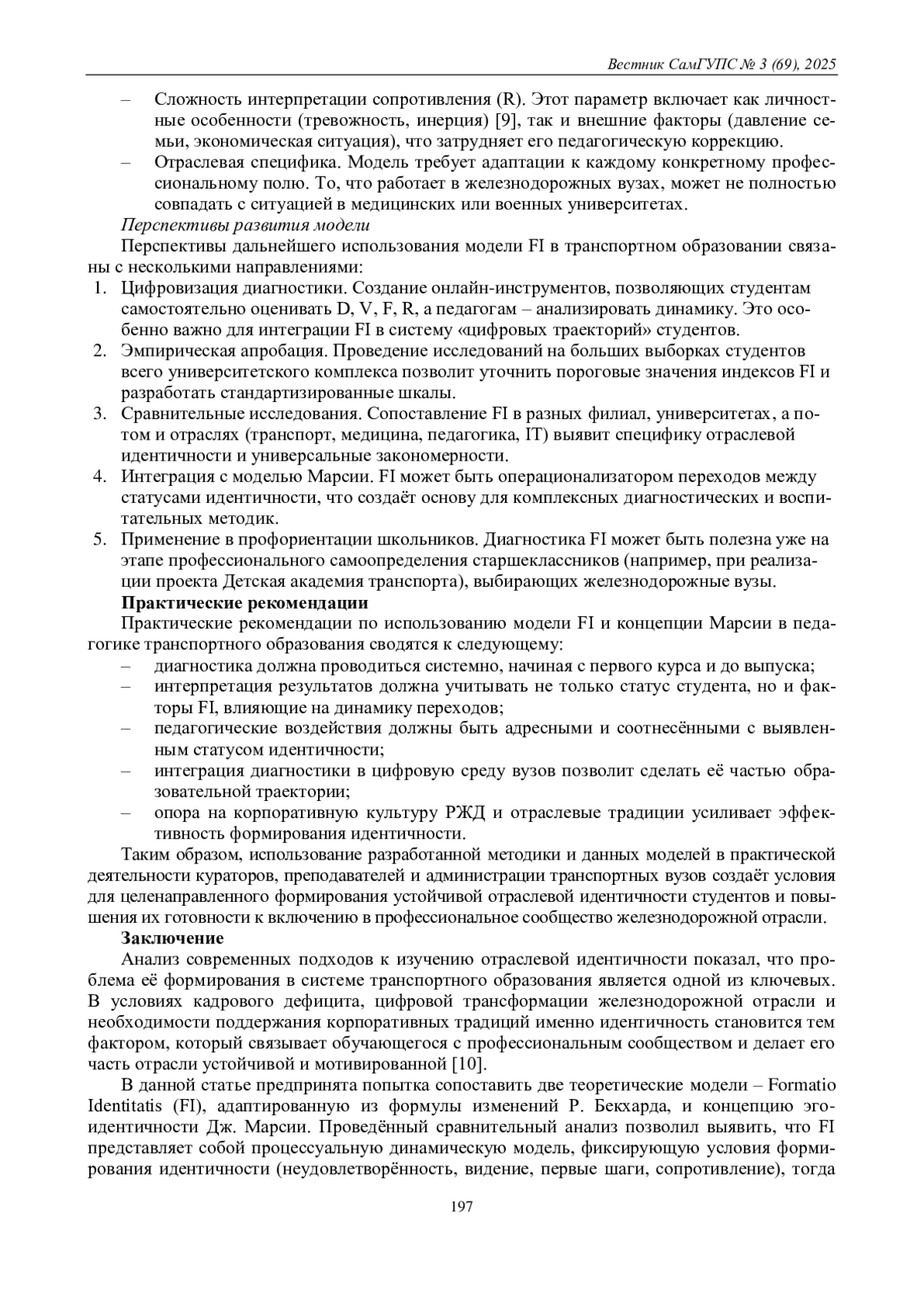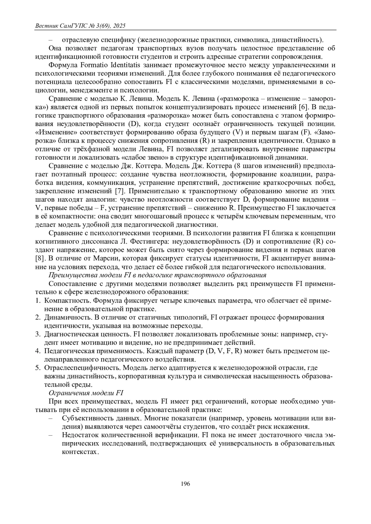1. Пыркова М. А. Формула изменений Р. Бекхарда как инструмент анализа готовности студентов к формированию отраслевой идентичности // Вестник СамГУПС. 2025. № 2 (68). С. 206-210.