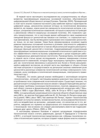 В первой части настоящего исследования мы сосредоточились на общих моментах трансформации моральных оснований политики, обусловленной цифровизацией общественного уклада [Сунами, Павлова, 2024]. Проведенный в этой части анализ позволил вычленить ряд наиболее важных характеристик цифровой среды, результатом влияния которых на политические феномены является, во-первых, новое качество связанности политических акторов, а вовторых, ускорение политических изменений, которые в совокупности приводят к увеличению гибкости моральных оснований политики. Это позволило сделать предположение, что в настоящее время наблюдается явно выраженное смещение фокуса от ценностей как таковых к их слепкам, т. е. отдельным частным феноменам, как бы являющимся признаками или отражением ценностей, их тенью, но не ими самими.