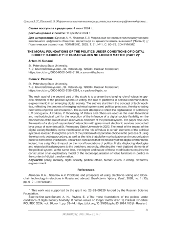 52. Sunami A.N., Pavlova Е.V. The moral foundations of the politics under conditions of digital society flexibility: If human values no longer matter (part 1). Political Expertise: POLITEX, 2024, vol. 20, no. 1, P. 33-44. (In Russian). DOI: 10.21638/spbu23.2024.103