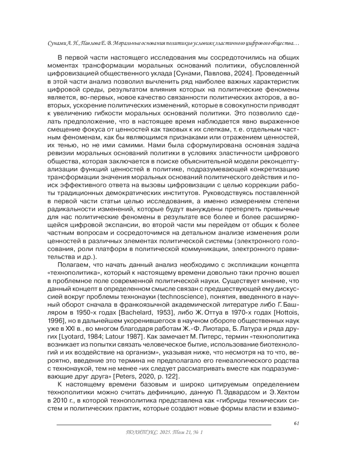 7. Сунами А. Н., Павлова Е. В. Моральные основания политики в условиях эластичного цифрового общества: перестанут ли ценности иметь значение? (часть 1) // Политическая экспертиза: ПОЛИТЭКС. 2024. Т. 20, № 1. С. 33-44. DOI: 10.21638/spbu23.2024.103 EDN: EUQBHV