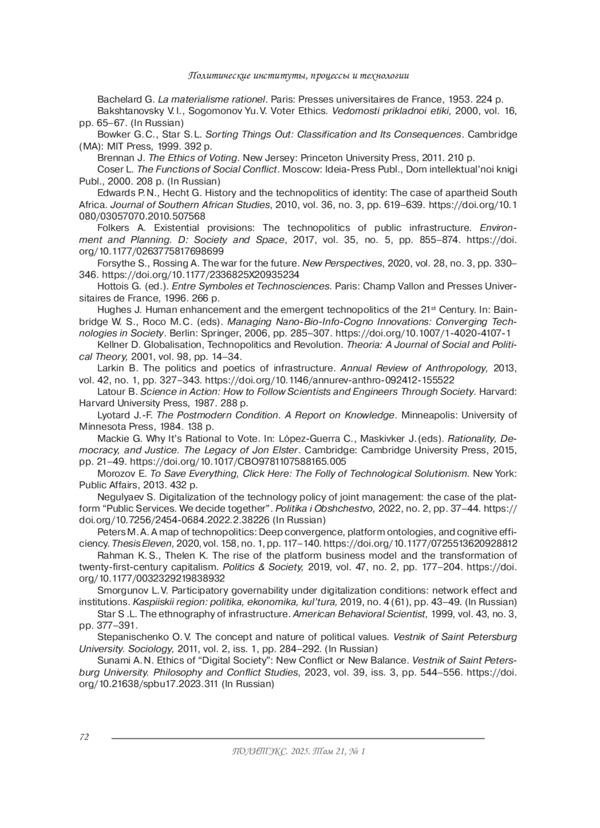46. Peters M.A. A map of technopolitics: Deep convergence, platform ontologies, and cognitive efficiency. Thesis Eleven. 2020. Vol. 158 (1). P. 117-140. DOI: 10.1177/0725513620928812 EDN: IUBRLV