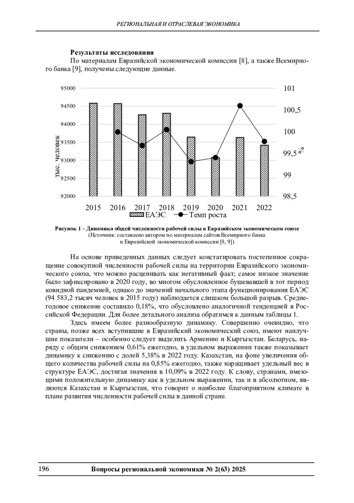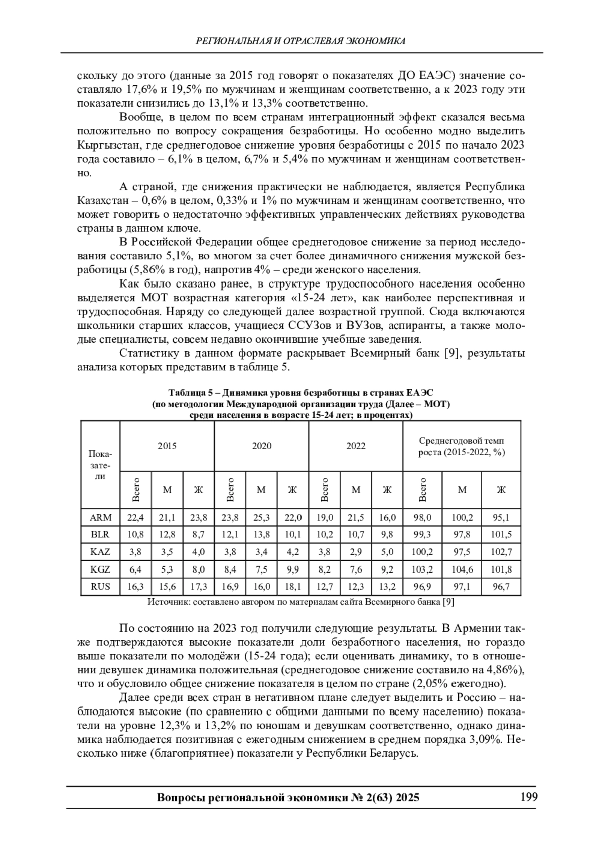 Целью научной статьи является проведение анализа состояния безработицы как в целом по населению ЕАЭС, так и применительно к наиболее физически активной ее части-молодежи (15-24 года). В работе применены такие методы проведения экономико-статистического исследования как табличный и графический методы, метод изучения научных работ по тематике исследования, метод расчета основных показателей динамики и структуры и т. д. В результате полученных результатов установлено, что образование Евразийского экономического союза привнесло некий «баланс» в наблюдаемые показатели, и грамотная скоординированная политика государств станет залогом для большего снижения безработицы в исследуемом регионе.