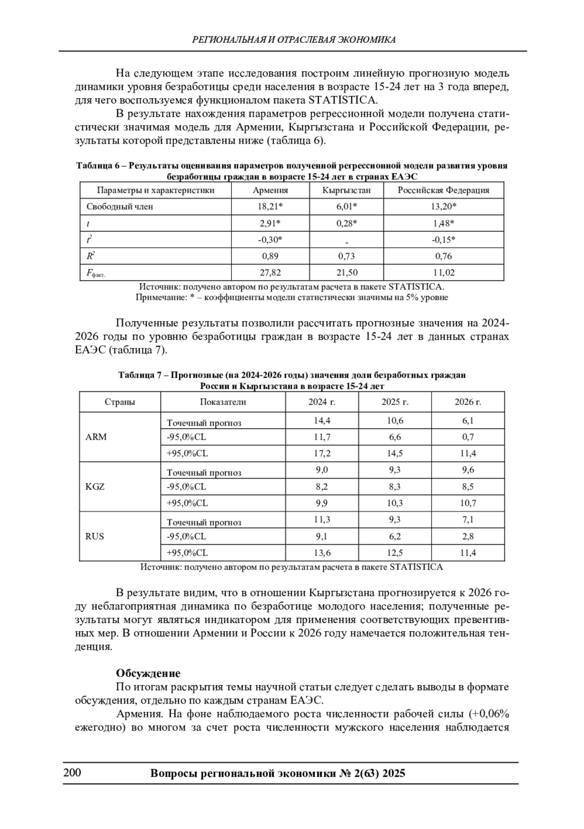 Статья посвящена вопросам проведения экономико-статистического анализа безработицы в странах Евразийского экономического союза в различных возрастных группах.