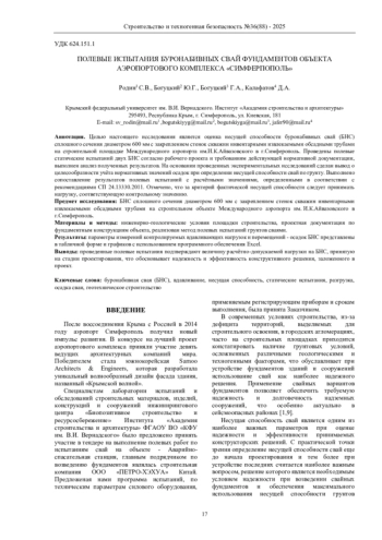 Целью настоящего исследования является оценка несущей способности буронабивных свай (БНС) сплошного сечения диаметром 600 мм с закреплением стенок скважин инвентарными извлекаемыми обсадными трубами на строительной площадке Международного аэропорта им. И. К. Айвазовского в г. Симферополь. Проведены полевые статические испытаний двух БНС согласно рабочего проекта и требованиям действующей нормативной документации, выполнен анализ полученных результатов. На основании проведенных экспериментальных исследований сделан вывод о целесообразности учёта нормативных значений осадок при определении несущей способности свай по грунту. Выполнено сопоставление результатов полевых испытаний с расчётными значениями, определенными в соответствии с рекомендациями СП 24.13330.2011. Отмечено, что за критерий фактической несущей способности следует принимать нагрузку, соответствующую контрольному значению. Предмет исследования: БНС сплошного сечения диаметром 600 мм с закреплением стенок скважин инвентарными извлекаемыми обсадными трубами на строительном объекте Международного аэропорта им. И. К. Айвазовского в г. Симферополь. Материалы и методы: инженерно-геологические условия площадки строительства, проектная документация по фундаментным конструкциям объекта, реализован метод полевых испытаний грунтов сваями. Результаты: параметры измерений контролируемых вдавливающих нагрузок и перемещений - осадок БНС представлены в табличной форме и графиков с использованием программного обеспечения Excel. Выводы: проведенные полевые испытания подтверждают величину расчётно-допускаемой нагрузки на БНС, принятую на стадии проектирования, что обосновывает надежность и эффективность конструктивного решения, заложенного в проект.