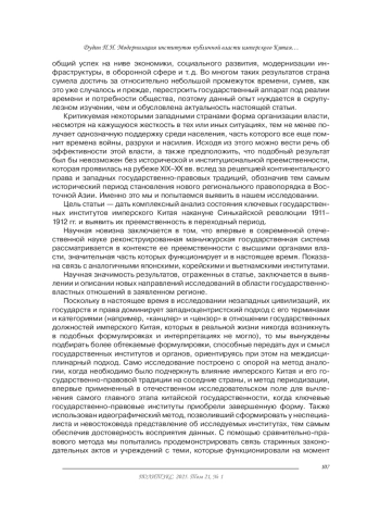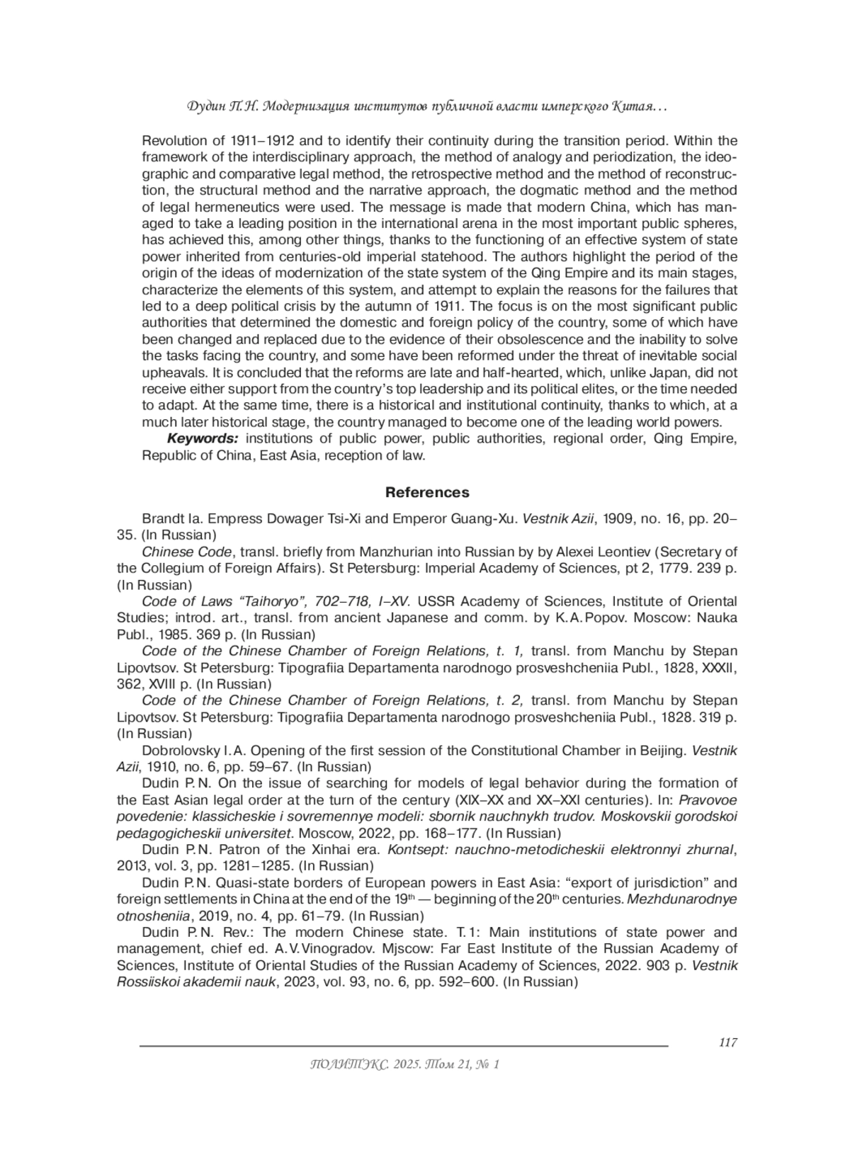Актуальность исследования обусловлена той ролью, которую Китай играет в мире и регионе. Предметом изучения является маньчжурская государственная система в преддверии формирования нового регионального порядка в Восточной Азии в начале ХХ в. Цель статьи — дать комплексный анализ состояния ключевых государственных институтов имперского Китая накануне Синьхайской революции 1911–1912 гг. и выявить их преемственность в переходный период. В рамках междисциплинарного подхода были использованы метод аналогии и периодизации, идеографический и сравнительно-правовой метод, ретроспективный метод и метод реконструкции, структурный метод и нарративный подход, догматический метод и метод юридической герменевтики. Делается посыл о том, что современный Китай, сумевший занять на международной арене лидирующие позиции в наиболее важных общественных сферах, осуществил это в том числе и благодаря функционированию эффективной системы государственной власти, унаследованной от многовековой имперской государственности. Автор освещает период зарождения идей модернизации государственной системы империи Цин и основные ее этапы, характеризуют элементы данной системы, предпринимает попытку объяснить причины неудач, приведших к глубокому политическому кризису к осени 1911 г. В центре внимания — наиболее знаковые органы государственной власти, определявшие внутреннюю и внешнюю политику страны, часть из которых подверглась изменениям и замене из-за очевидности их устаревания и невозможности решения стоящих перед страной задач, а часть реформировалась под угрозой неизбежных социальных потрясений. Сделан вывод о запоздалости и половинчатости реформ, которые, в отличие от Японии, не получили ни поддержки со стороны высшего руководства страны и ее политических элит, ни времени, необходимого для адаптации. Вместе с тем наблюдается историческая и институциональная преемственность, благодаря которой в значительно более поздний исторический этап страна сумела войти в число ведущих мировых держав