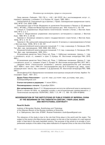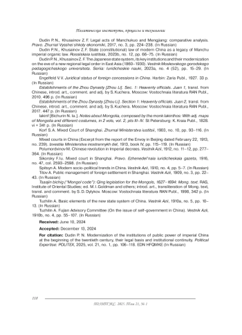 35. Dudin P. N., Khusainov Z. F. State (constitutional) law of modern China as a legacy of Manchu imperial organic law. Rossiiskaia iustitsiia, 2023b, no. 12, pp. 66-75. (In Russian).