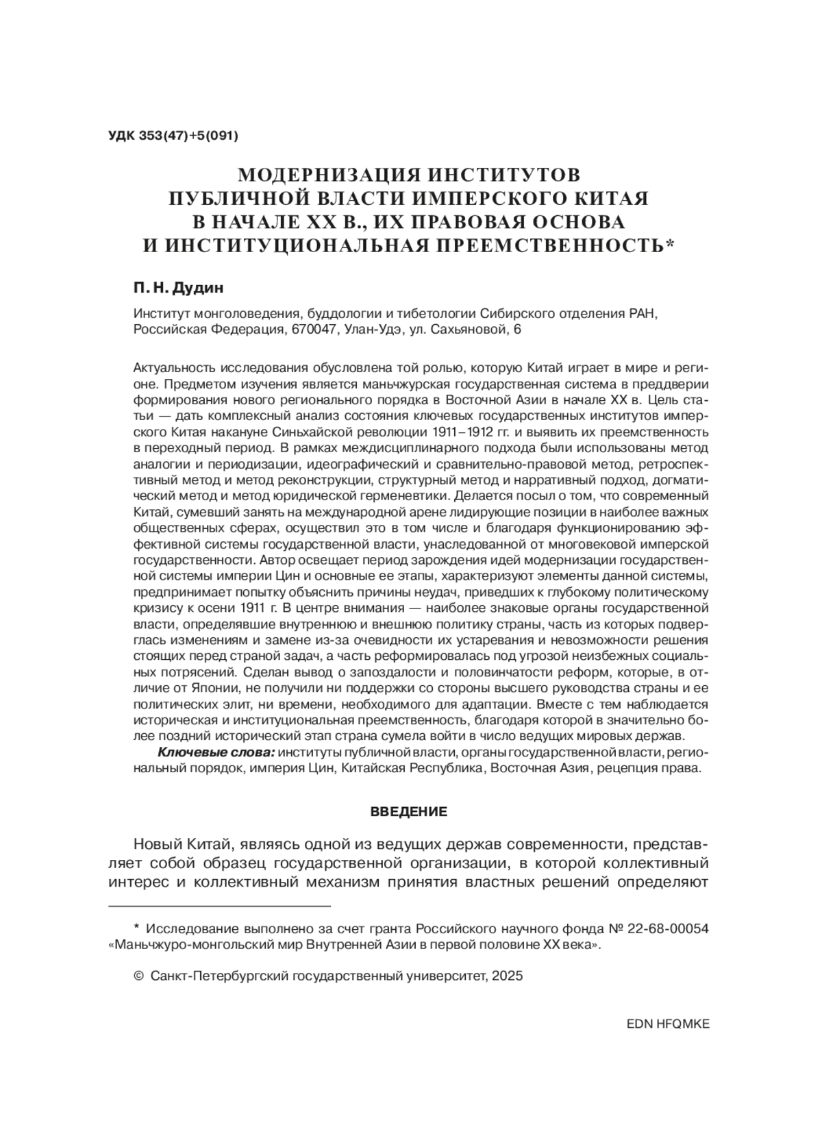 9. Дудин П. Н., Хусаинов З. Ф. Государственное (конституционное) право современного Китая как наследие маньчжурского имперского органического права// Российская юстиция. 2023b. № 12. С. 66-75. EDN: RDTXFP