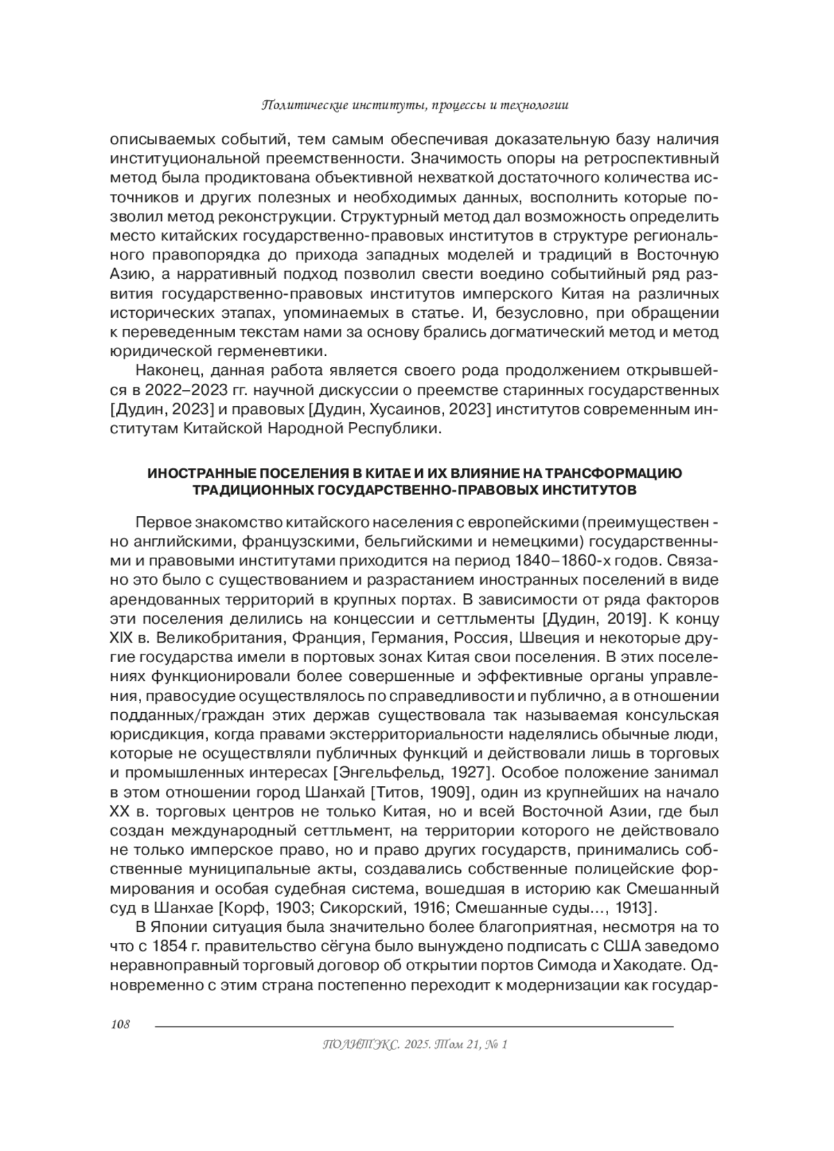 4. Дудин П. Н. Квазигосударственные границы европейских держав в Восточной Азии: “экспорт юрисдикции” и иностранные поселения в Китае в конце XIX - начале ХХ в // Международные отношения. 2019. № 4. С. 61-79.