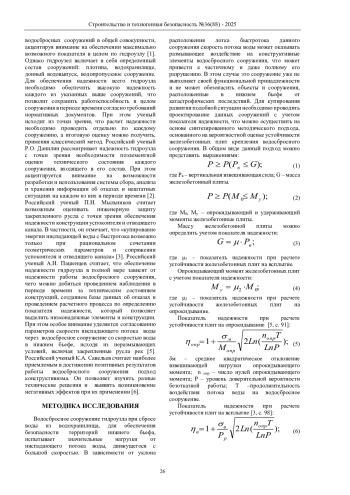 Выводы: разработан и опробован методический подход к оценке устойчивости железобетонных плит крепления быстротока водосбросного сооружения в основе, которого находится сопоставление опрокидывающего и взвешивающего моментов с учетом показателя доверительной вероятности безотказной работы сооружения.
